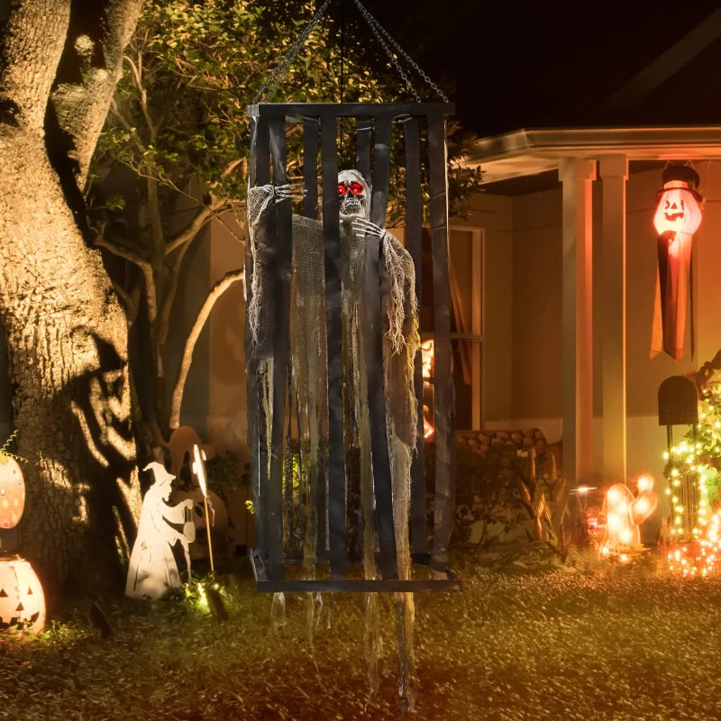 Create a spine-chilling atmosphere with the Outsunny Animatronic Hanging Skeleton Reaper in Cage. This voice-activated prop reacts to sound with creepy movements and flashing eyes, making it perfect for haunted houses, Halloween parties, or spooky indoor displays. Easy to set up, the hanging skeleton reaper provides an eerie and interactive addition to your seasonal décor, guaranteed to startle and entertain your guests.