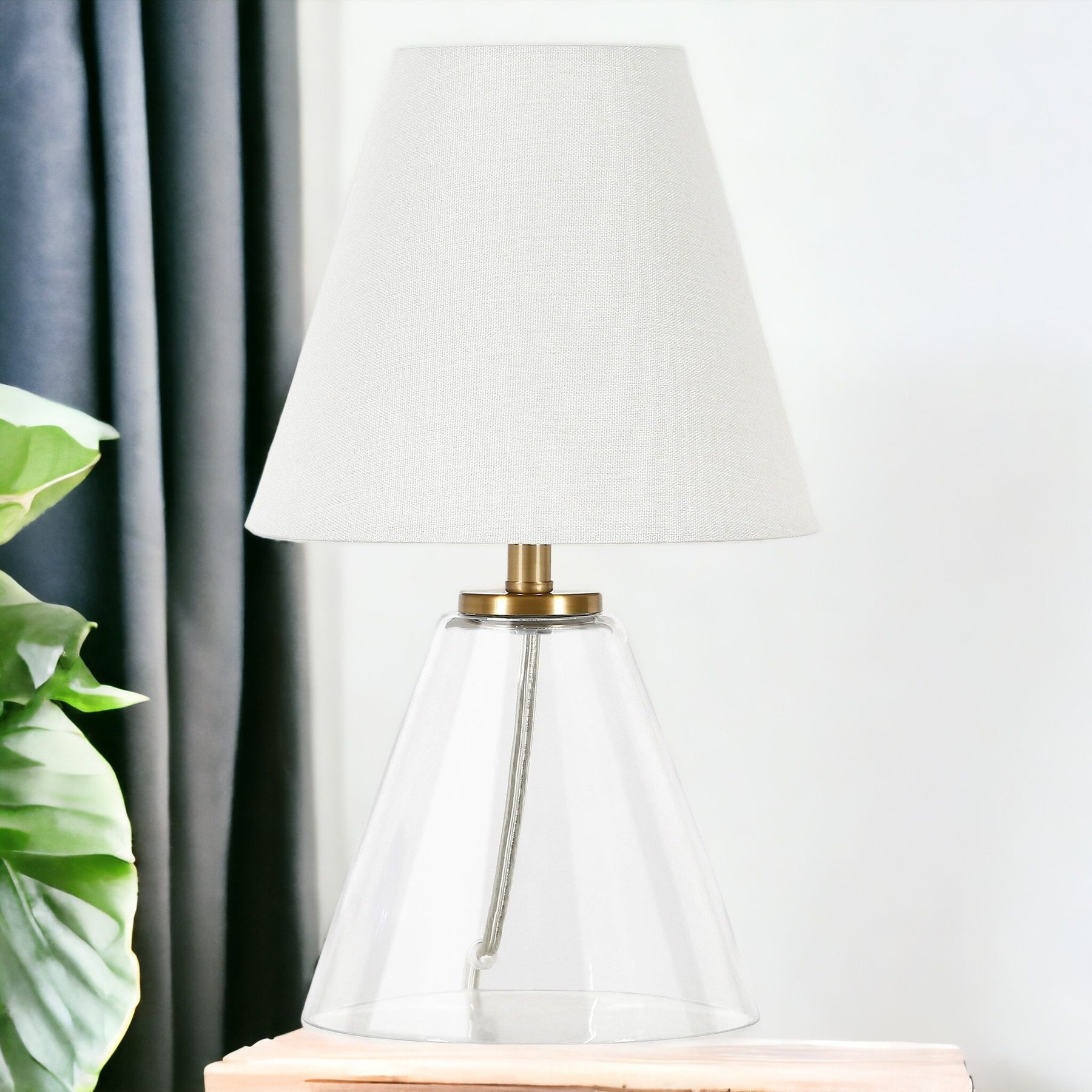 This 14-inch clear glass cylinder table lamp with white drum shade is a great way to add some brightness to any corner of your home. The base of this lamp is made of clear glass. The white drum fabric shade is a great compliment to this lamp. This standard table lamp is designed to provide general lighting to the area. High quality design makes this a great lamp for not only lighting, but accenting a room with style. It is perfect for virtually any decor. 13.62-inch H x 8-inch W x 8-inch D
