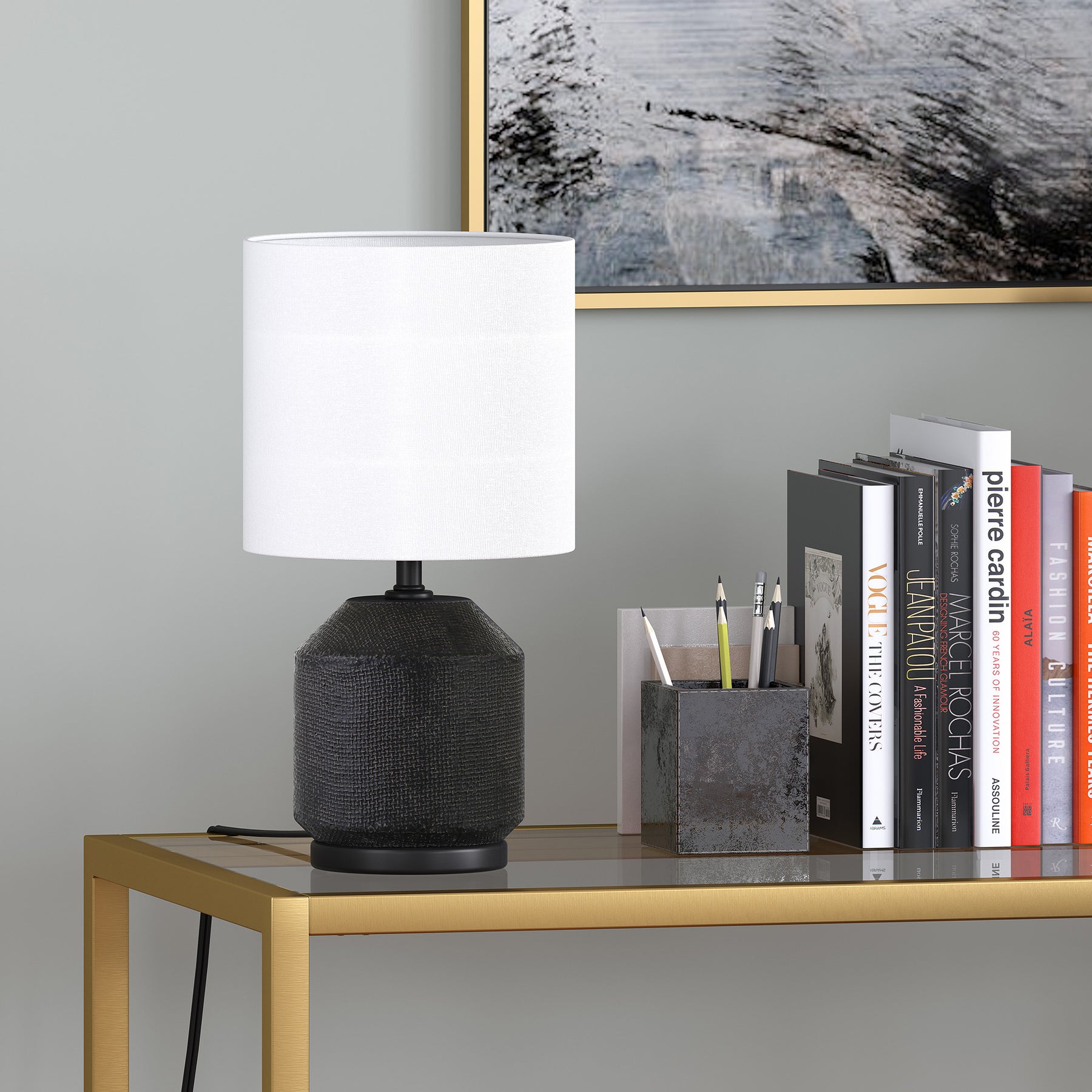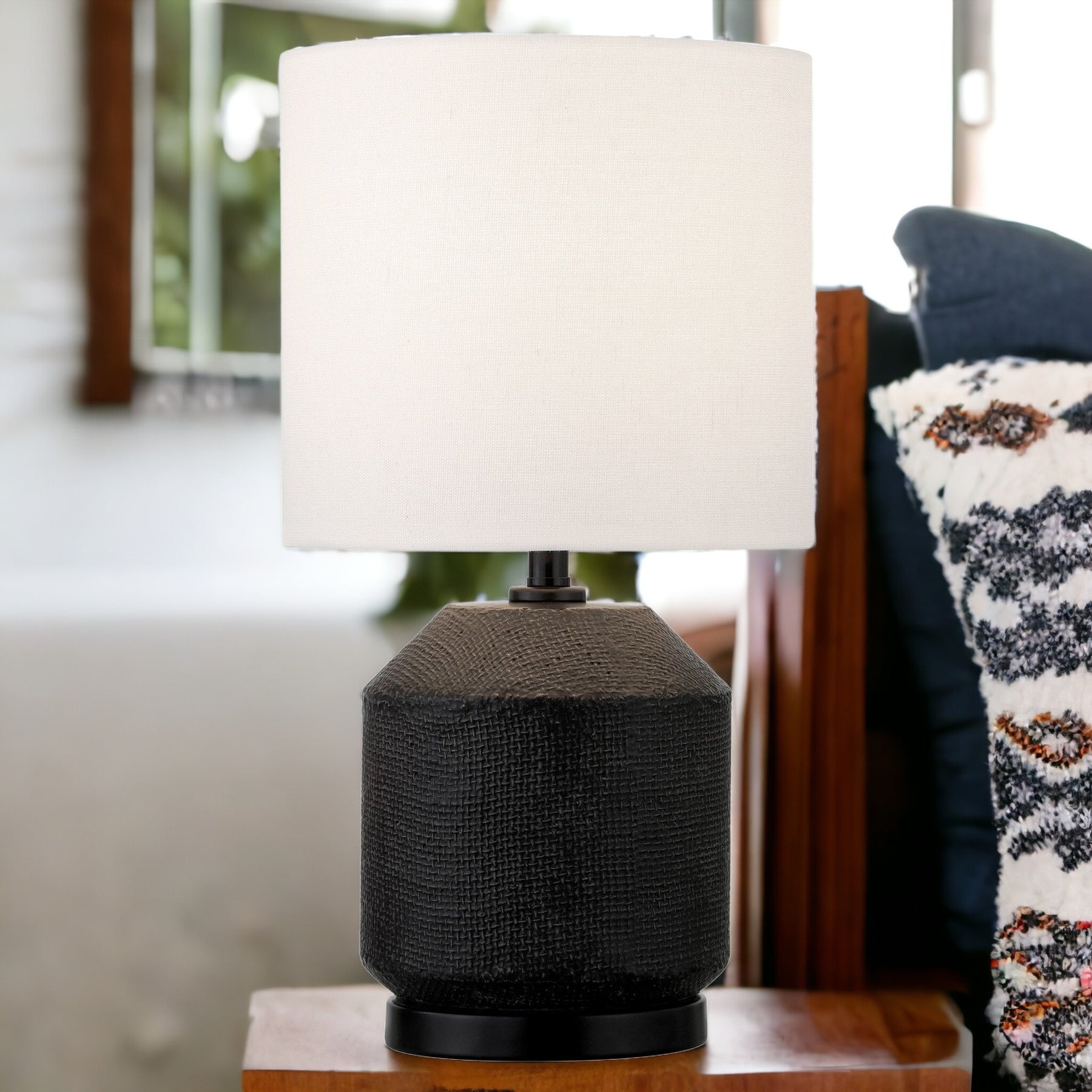 Bring of level of elegance and freshness to your space with this high quality 15-inch black ceramic cylinder table lamp with white drum shade. The base of this lamp is made of black ceramic. The white shade has a drum shape and is made from fabric. This standard table lamp is designed to provide general lighting to the area. Use this lamp anywhere and elevate the look of the whole space. The perfect lamp to create just the right natural and soothing light in your space. 15-inch H x 5.5-inch W x 5.5-inch D