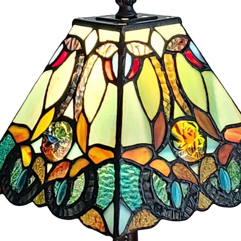 Add a bright anchor to your room with this 15-inch dark brown metal candlestick table lamp with green and black shade. A gorgeous dark brown metal base brings just the right amount of pizzazz to this fabulous lamp. This standard table lamp is designed to provide general lighting to the area. High quality design makes this a great lamp for not only lighting, but accenting a room with style. It is perfect for virtually any decor. 15-inch H x 14-inch W x 9-inch D