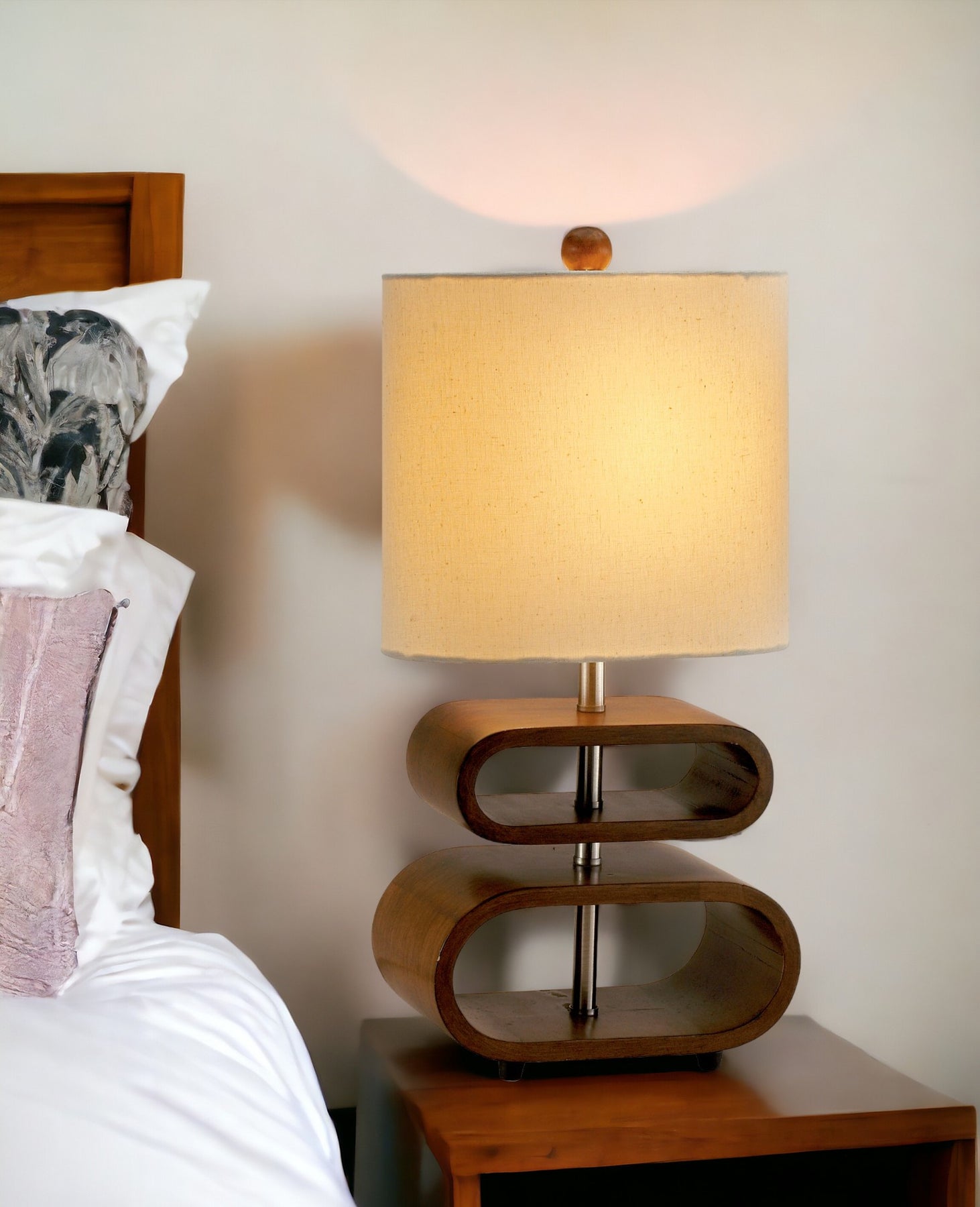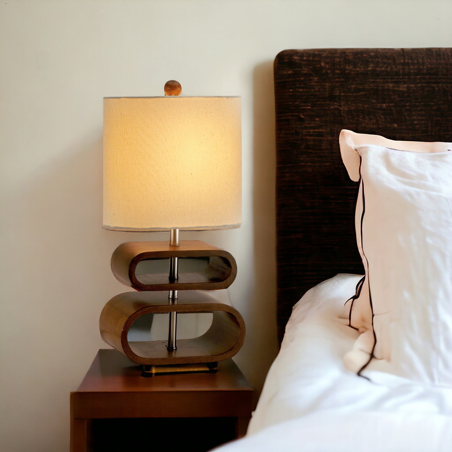 This 19-inch brown retro ovals wood bedside lamp with natural shade is a great way to add some brightness to any corner of your home. The lamp is made of sturdy manufactured wood in a walnut brown color that is bent and stacked in ovals for a retro mid-century vibe. Add a soft and cozy glow to your bedroom, or any room. Great for evening reading. Bring some lite and good vibes into your space with this updated and stylishly designed lamp. 19-inch H x 9.25-inch W x 6-inch D
