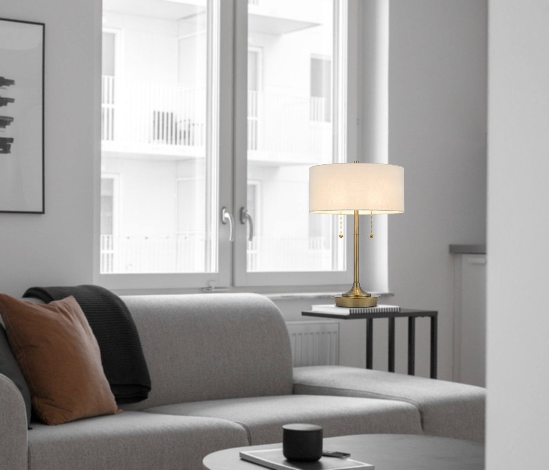 Add a bright anchor to your room with this 20" antiqued brass metal two light table lamp with white drum shade. The base of this lamp is made of metal finished in a antiqued brass tone. The white shade has a drum shape and is made from fabric. This standard table lamp is designed to provide general lighting to the area. The light that this lamp throws is soft and warm to elevate the look of most any space in your home. The perfect lamp to create just the right natural and soothing light in your space. 20" H x 13" W x 13" D