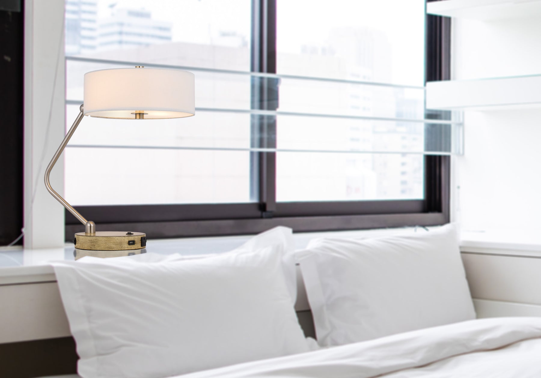 Add a bright anchor to your room with this 20" nickel metal two light desk usb table lamp with white drum shade. The lamp is made of sturdy metaland features a nickel color. The white drum fabric shade is finishes this piece off nicely and symmetrically This desk lamp provides 'task lighting' that will illuminate your working area for reading or writing. High quality design makes this a great lamp for not only lighting, but accenting a room with style. The perfect lamp to create just the right natural and soothing light in your space. 20" H x 12.5" W x 12.5" D
