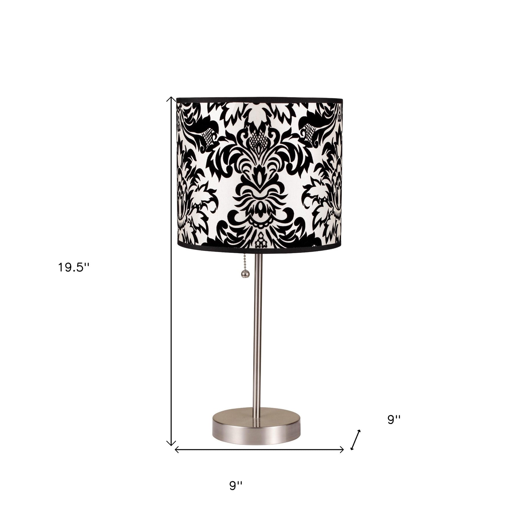 This 20" silver metal bedside table lamp with black and white classic drum shade is a great way to add some brightness to any corner of your home. The base of this lamp is made of silver metal. This good looking lamp includes a fabric drum shaped shade with a gorgeous black and white damask shade. Bedside table lamps help to add a soft and cozy glow to your bedroom. Great for evening reading! The light that this lamp throws is soft and warm to elevate the look of most any space in your home. The perfect lamp to create just the right natural and soothing light in your space. 19.5" H x 9" W x 9" D