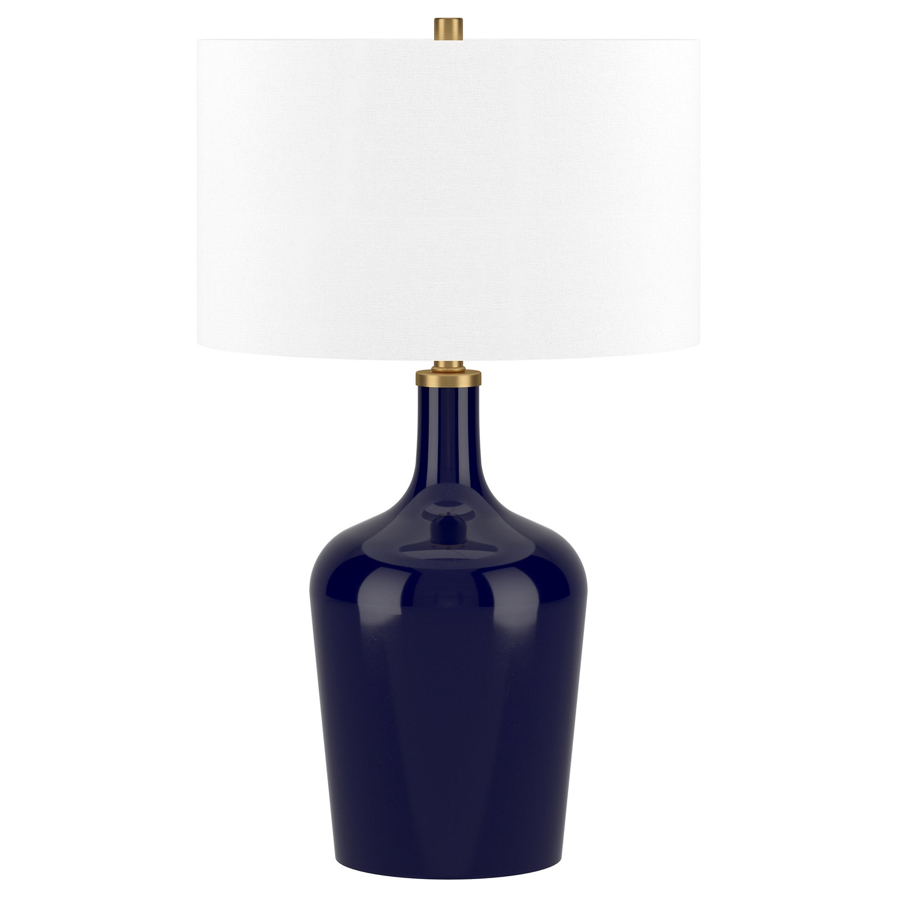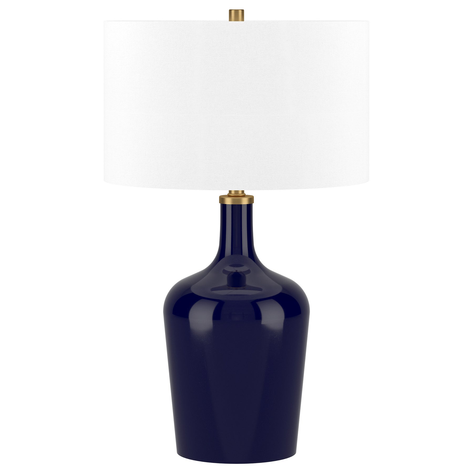 Add a bright anchor to your room with this 25-inch blue glass urn table lamp with white drum shade. The base of this lamp is made of glass finished in a blue tone. The white drum fabric shade is finishes this piece off nicely and symmetrically this standard table lamp is designed to provide general lighting to the area. The light that this lamp throws is soft and warm to elevate the look of most any space in your home. The perfect lamp to create just the right natural and soothing light in your space. 25-inch H x 15-inch W x 15-inch D