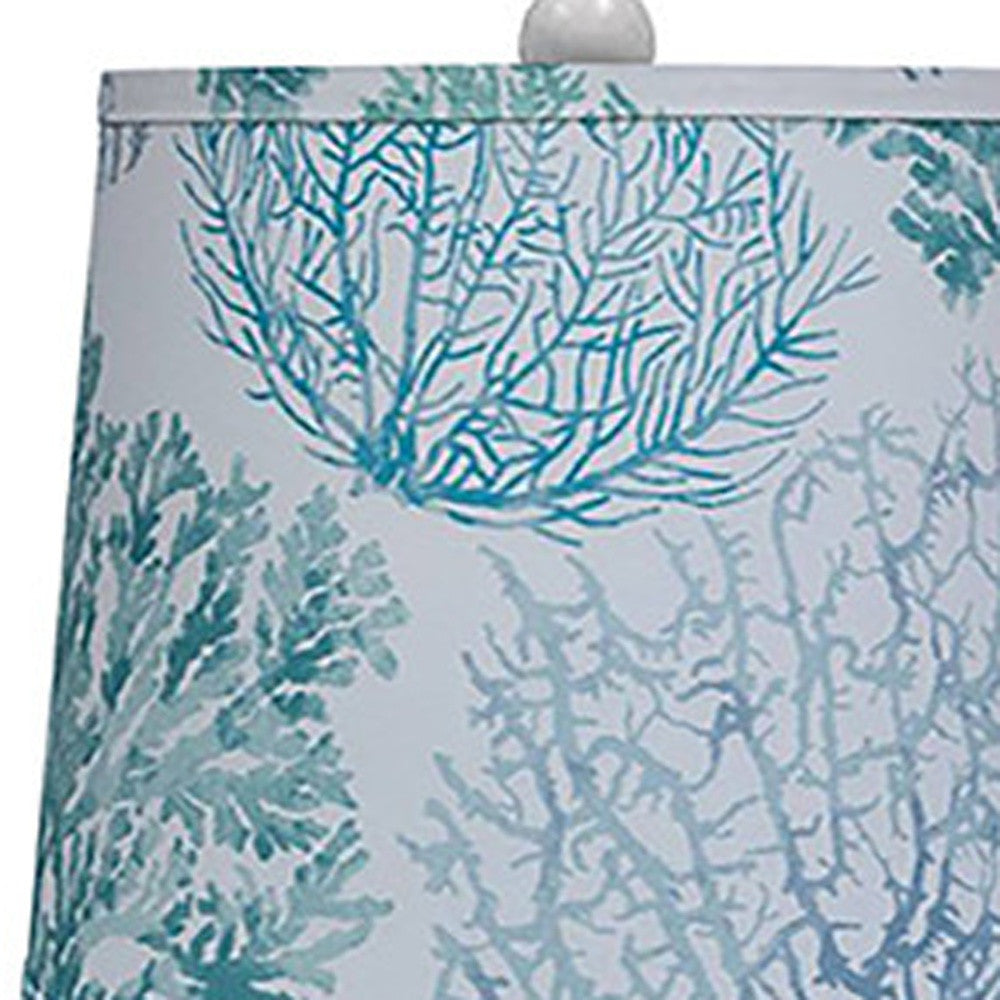 Add a bright anchor to your room with this 29" antique white candlestick table lamp with aqua coral tapered drum shade. The base of this lamp is made of resin finished in a antique white tone. This standard table lamp is designed to provide general lighting to the area. Use this lamp anywhere and elevate the look of the whole space. Bring some lite and good vibes into your space with this updated and stylishly designed lamp. 29" H x 14" W x 14" D