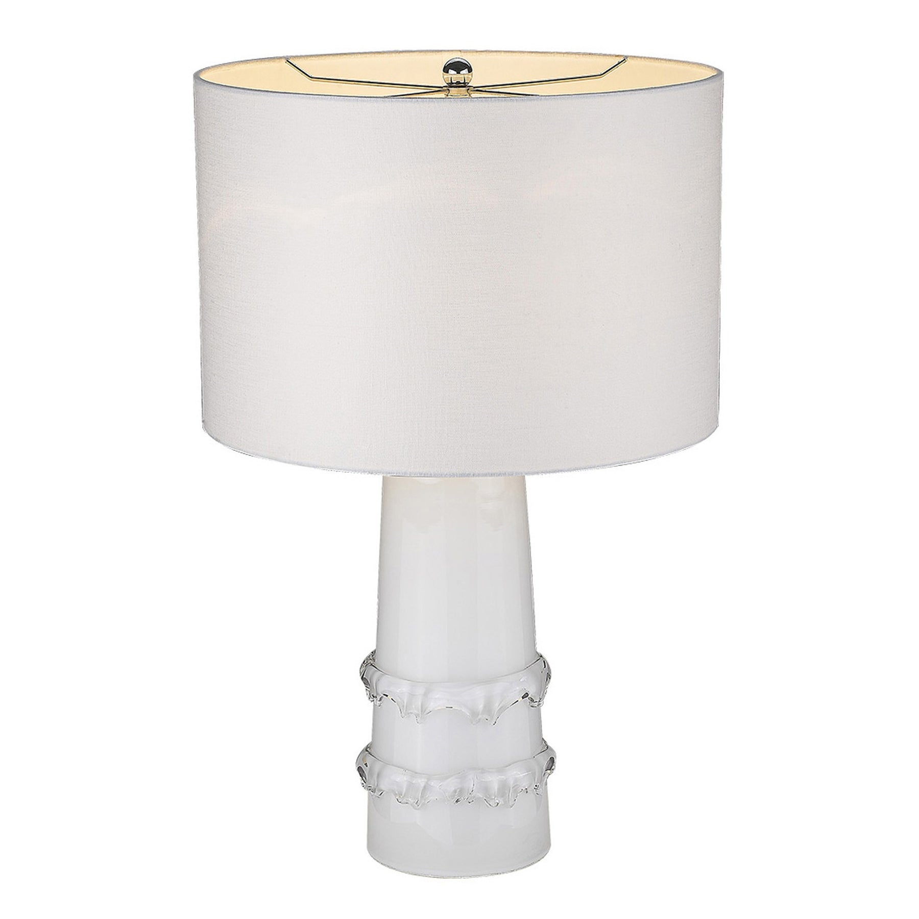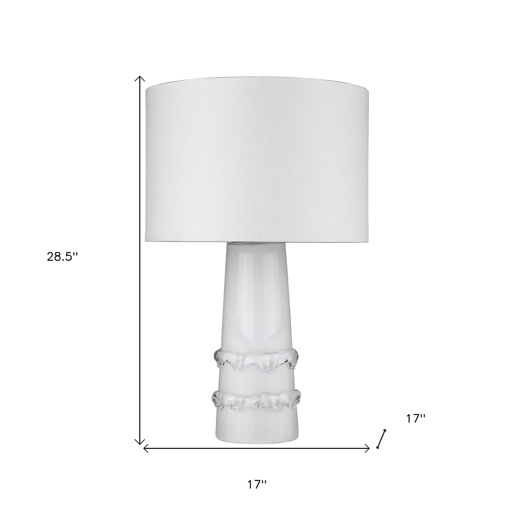Embrace the good life with this hard working and stylish 29" white glass column table lamp with white drum shade. The lamp is made of sturdy glassand features a white color. The white drum fabric shade is a great compliment to this lamp. Use this lamp anywhere and elevate the look of the whole space. The perfect lamp to create just the right natural and soothing light in your space. 28.5" H x 17" W x 17" D