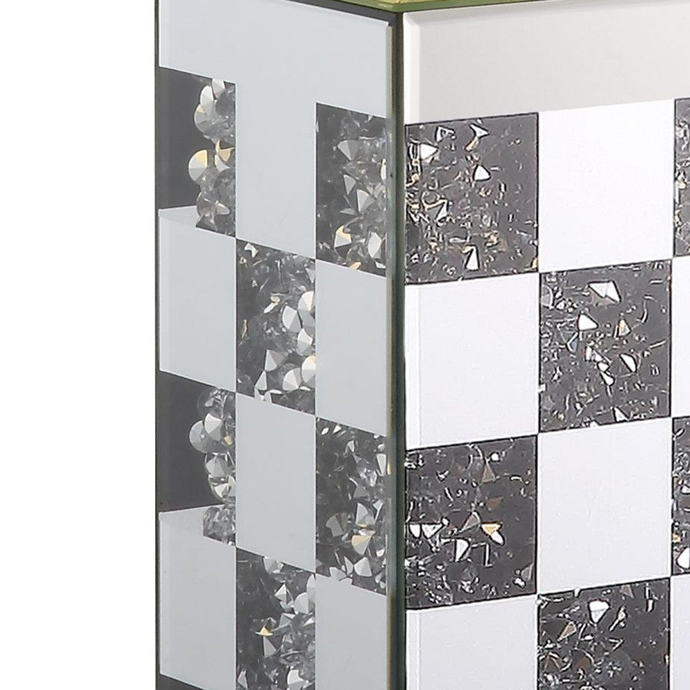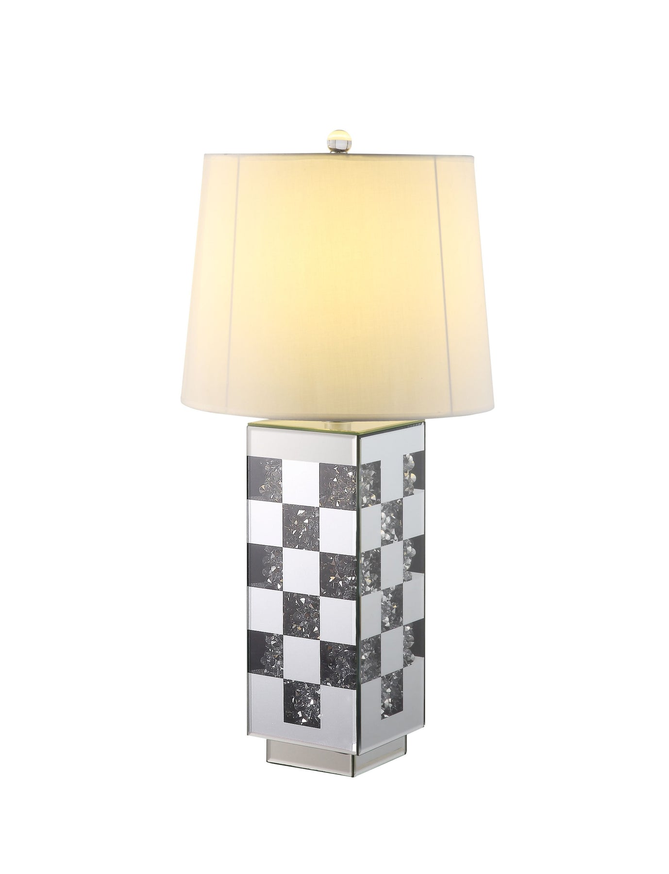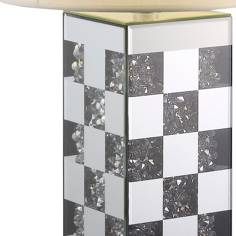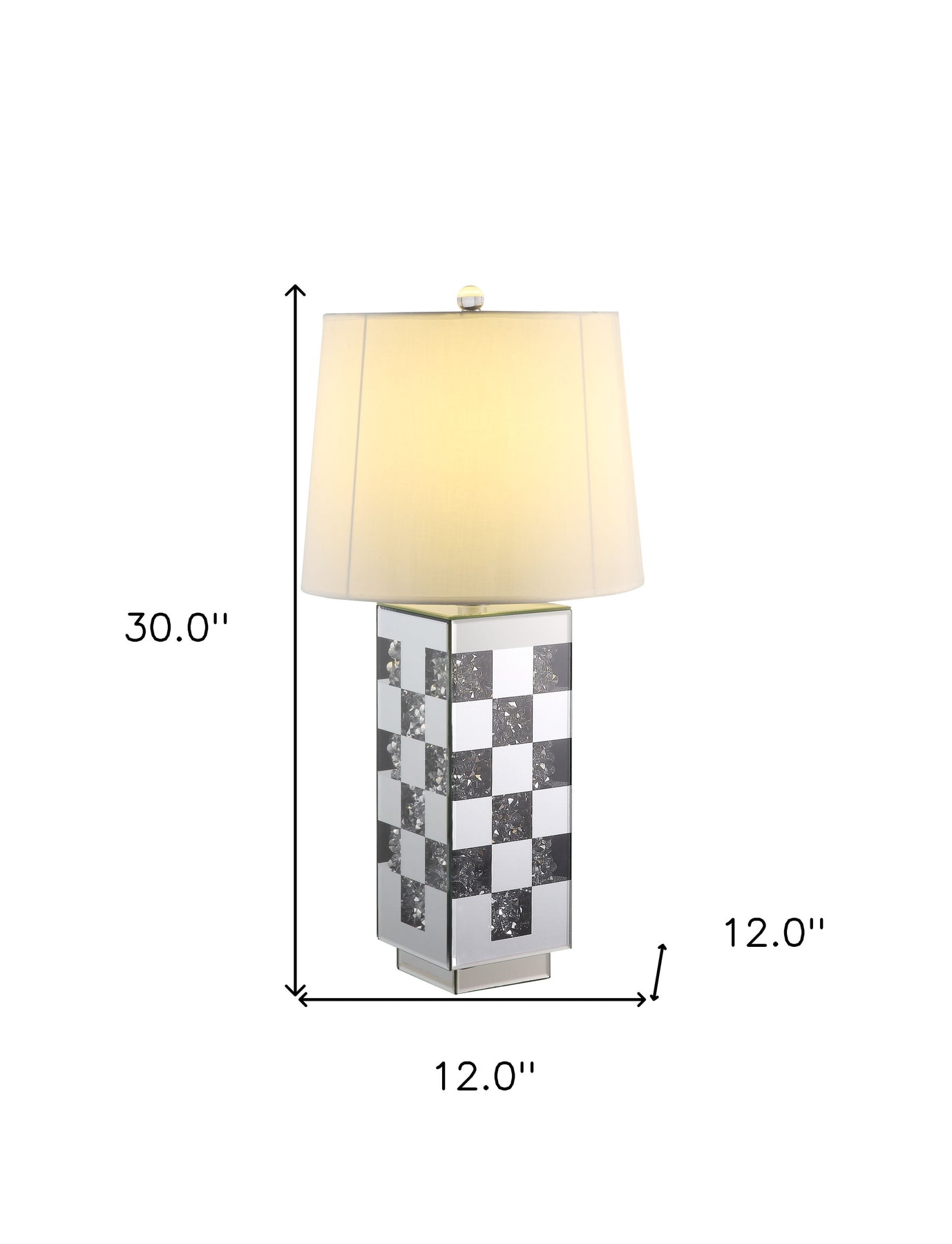With this 30-inch black and silver glass table lamp with white empire shade you can bring in design to any space along with adding some ambient lighting. The base of this lamp features a squared off shape and is black and silver with mirrored glass with faux crystal diamonds that form a checker design. The white empire fabric shade is finishes this piece off nicely and symmetrically this standard table lamp is designed to provide general lighting to the area. Use this lamp anywhere and elevate the look of the whole space. The perfect lamp to create just the right natural and soothing light in your space. 30-inch H x 12-inch W x 12-inch D
