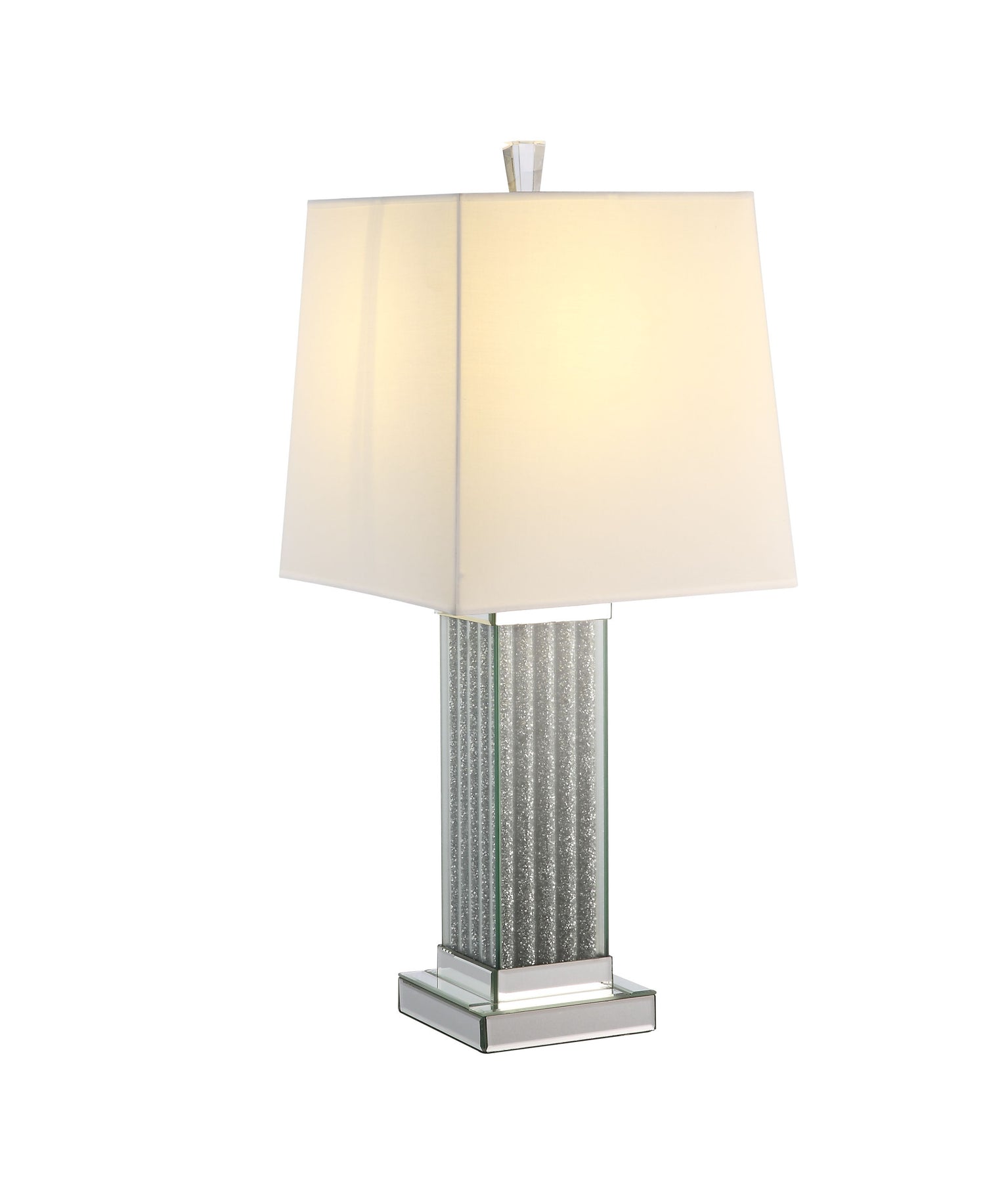 Embrace the good life with this hard working and stylish 30" mirrored glass and faux stones table lamp with white square shade. A gorgeous squared off column mirrored glass base brings just the right amount of pizzazz to this fabulous lamp. Includes a white fabric, square shaped shade, making this a fashionable piece that will complement most any interior. This standard table lamp is designed to provide general lighting to the area. High quality design makes this a great lamp for not only lighting, but accenting a room with style. Bring some lite and good vibes into your space with this updated and stylishly designed lamp. 30" H x 13" W x 13" D