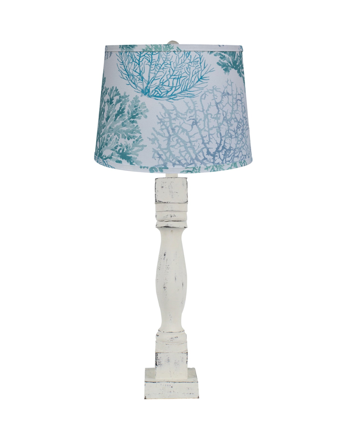 Embrace the good life with this hard working and stylish 30" rustic distressed white table lamp with turquoise coral empire shade. The lamp is made of sturdy polyresin and features a rustic distressed white color. This standard table lamp is designed to provide general lighting to the area. Use this lamp anywhere and elevate the look of the whole space. Bring some lite and good vibes into your space with this updated and stylishly designed lamp. 29.5" H x 12" W x 12" D