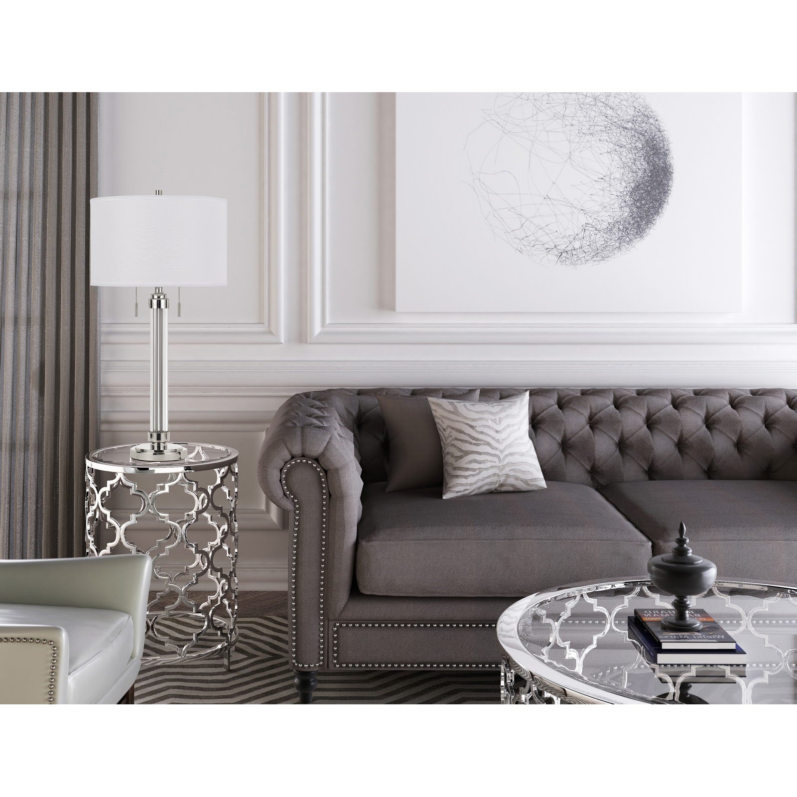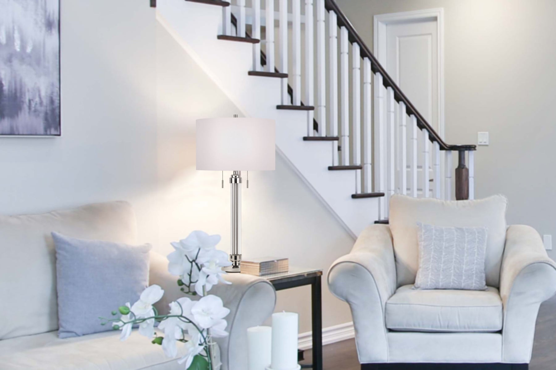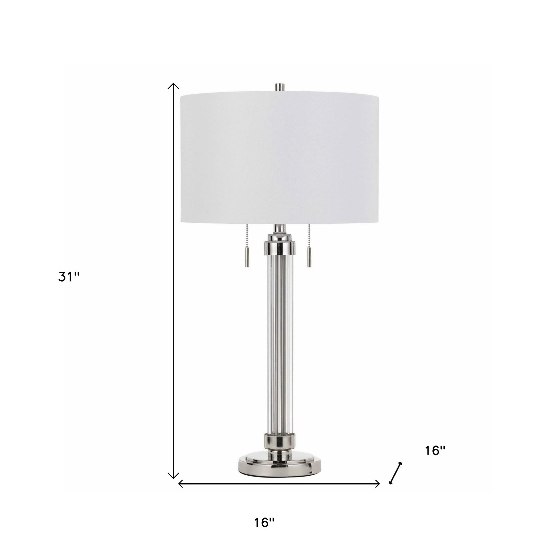 This 31" silver metallic metal two light table lamp with white drum shade is a great way to add some brightness to any corner of your home. A gorgeous silver metallic metalbase brings just the right amount of pizzazz to this fabulous lamp. The white shade has a drum shape and is made of linen, which makes it a perfect choice. This standard table lamp is designed to provide general lighting to the area. High quality design makes this a great lamp for not only lighting, but accenting a room with style. The perfect lamp to create just the right natural and soothing light in your space. 31" H x 16" W x 16" D