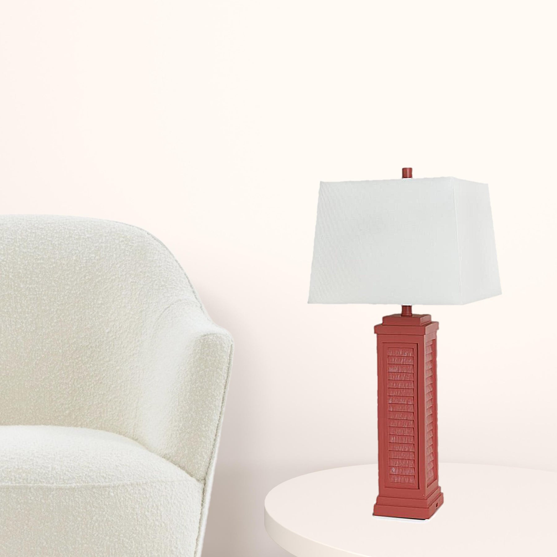 Add a bright anchor to your room with this 32" red table lamp with white rectangular shade. A gorgeous red polyresinbase brings just the right amount of pizzazz to this fabulous lamp. The white rectangular cotton shade is a great compliment to this lamp. This standard table lamp is designed to provide general lighting to the area. Use this lamp anywhere and elevate the look of the whole space. It is perfect for virtually any decor. 32" H x 5.5" W x 5.5" D