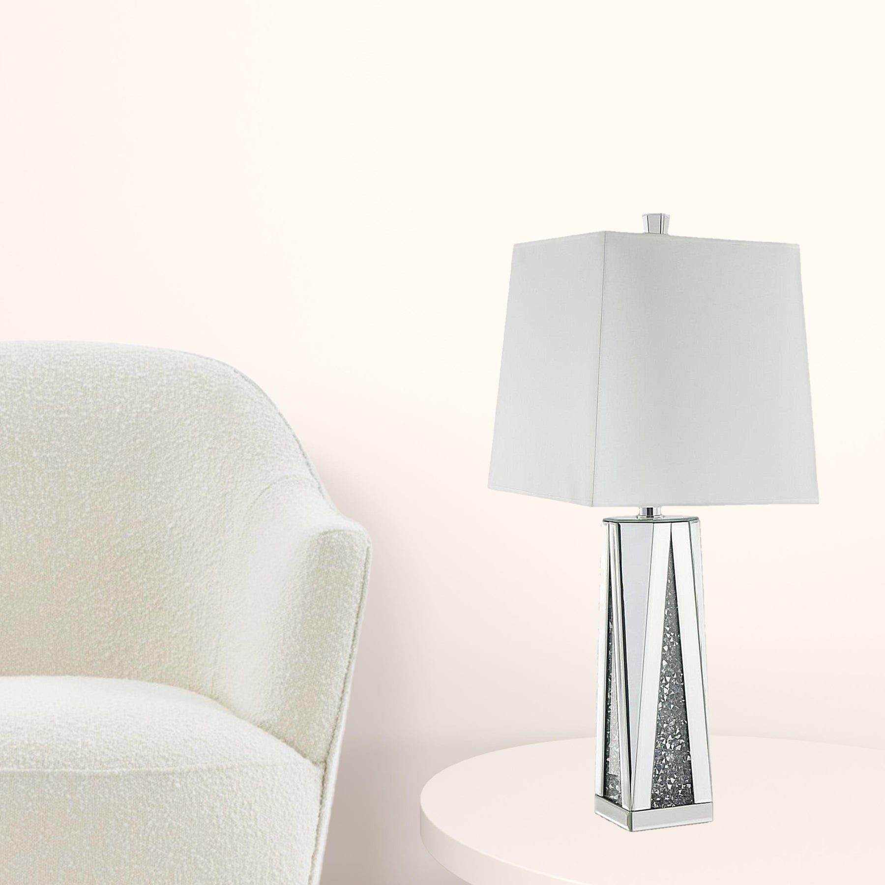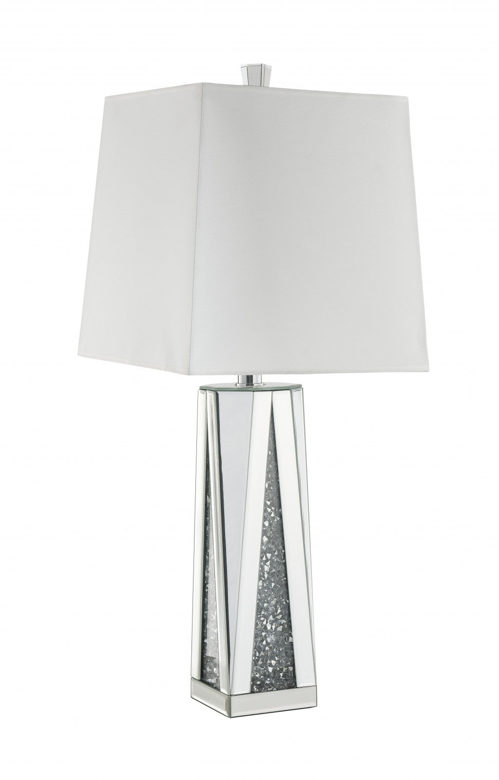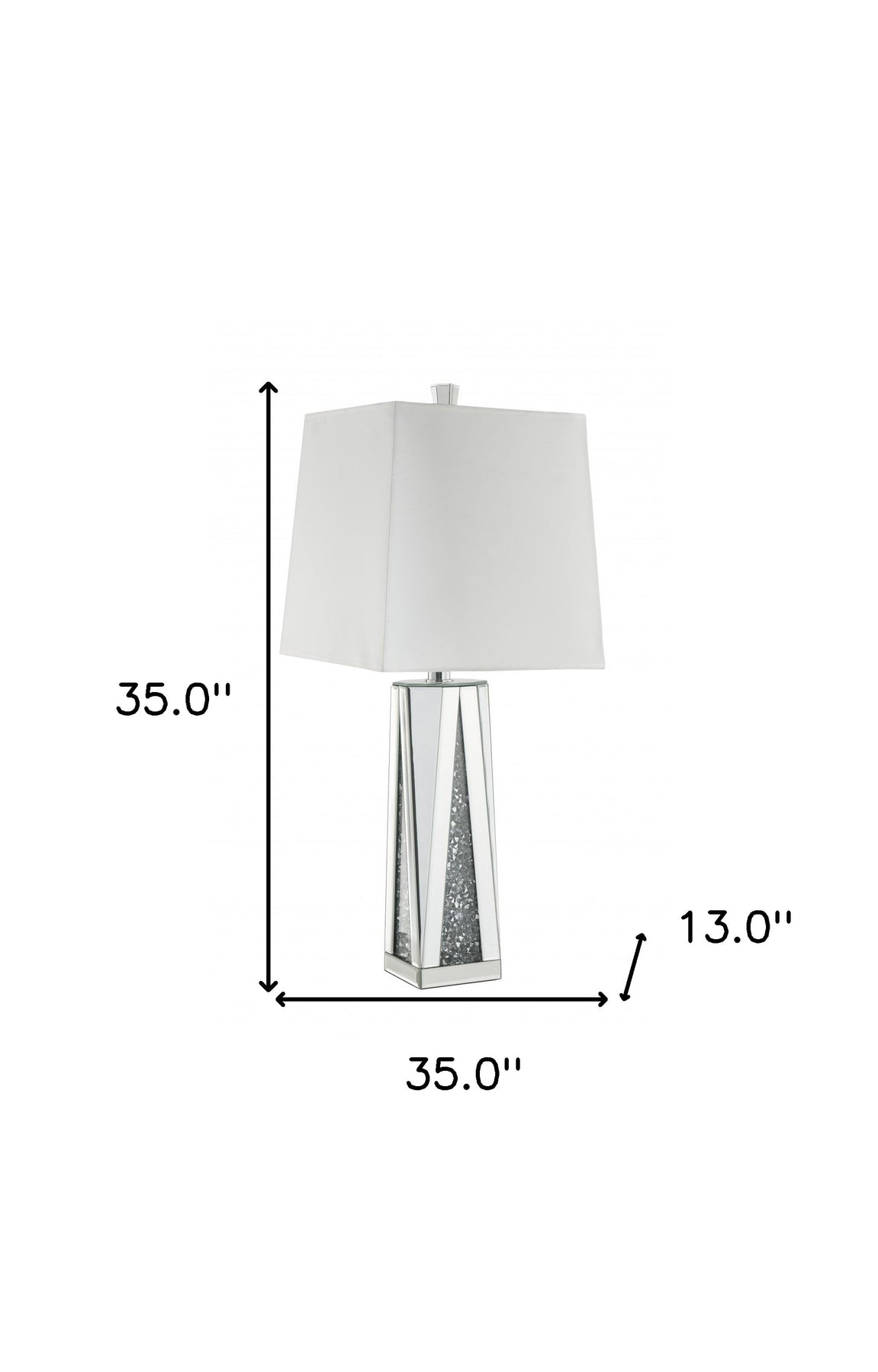 This 35" clear glass table lamp with white square shade is the perfect combination of design and function. The base of this lamp is made of glass finished in a clear tone. Includes a white fabric, square shaped shade, making this a fashionable piece that will complement most any interior. This standard table lamp is designed to provide general lighting to the area. Use this lamp anywhere and elevate the look of the whole space. The perfect lamp to create just the right natural and soothing light in your space. 35" H x 13" W x 13" D