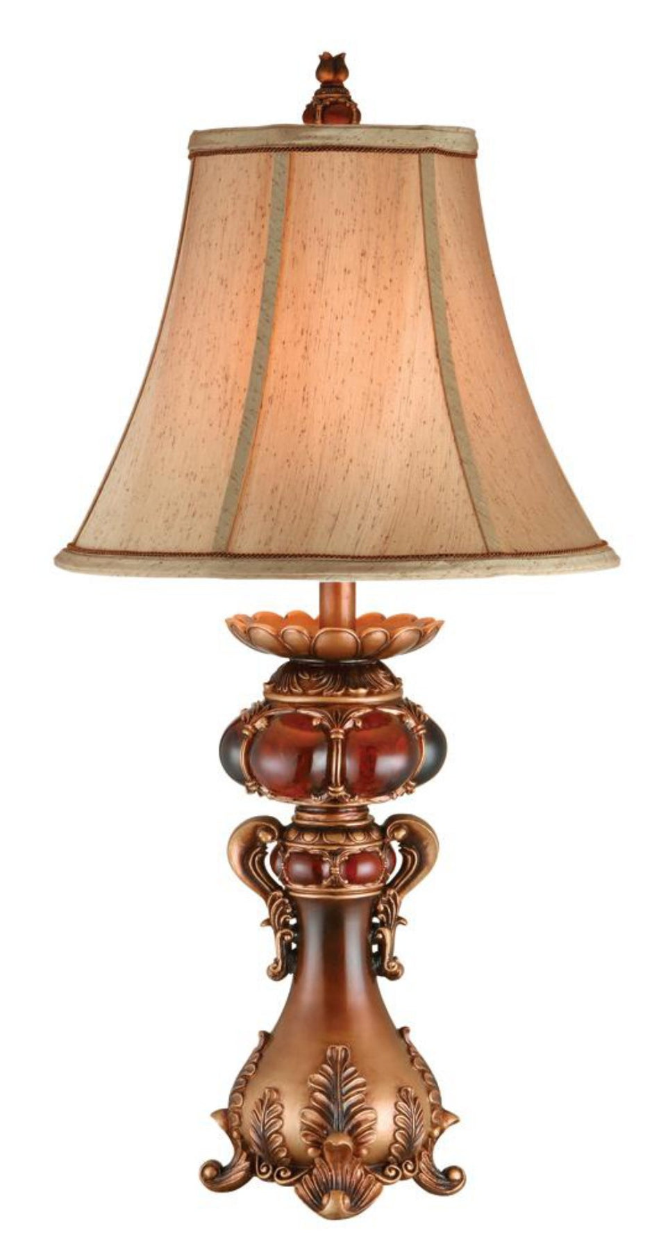 Add some unique style and fashion to your space with this Antique Inspired Table Lamp with Linen Lamp Shade. Transitional in style, this lamp will blend with multiple design aesthethics. The antiqued brown and red polyresin base is accented by beautiful antique-inspired engravings and is finished with a classic Linen shade. 31" x 17" x 17"