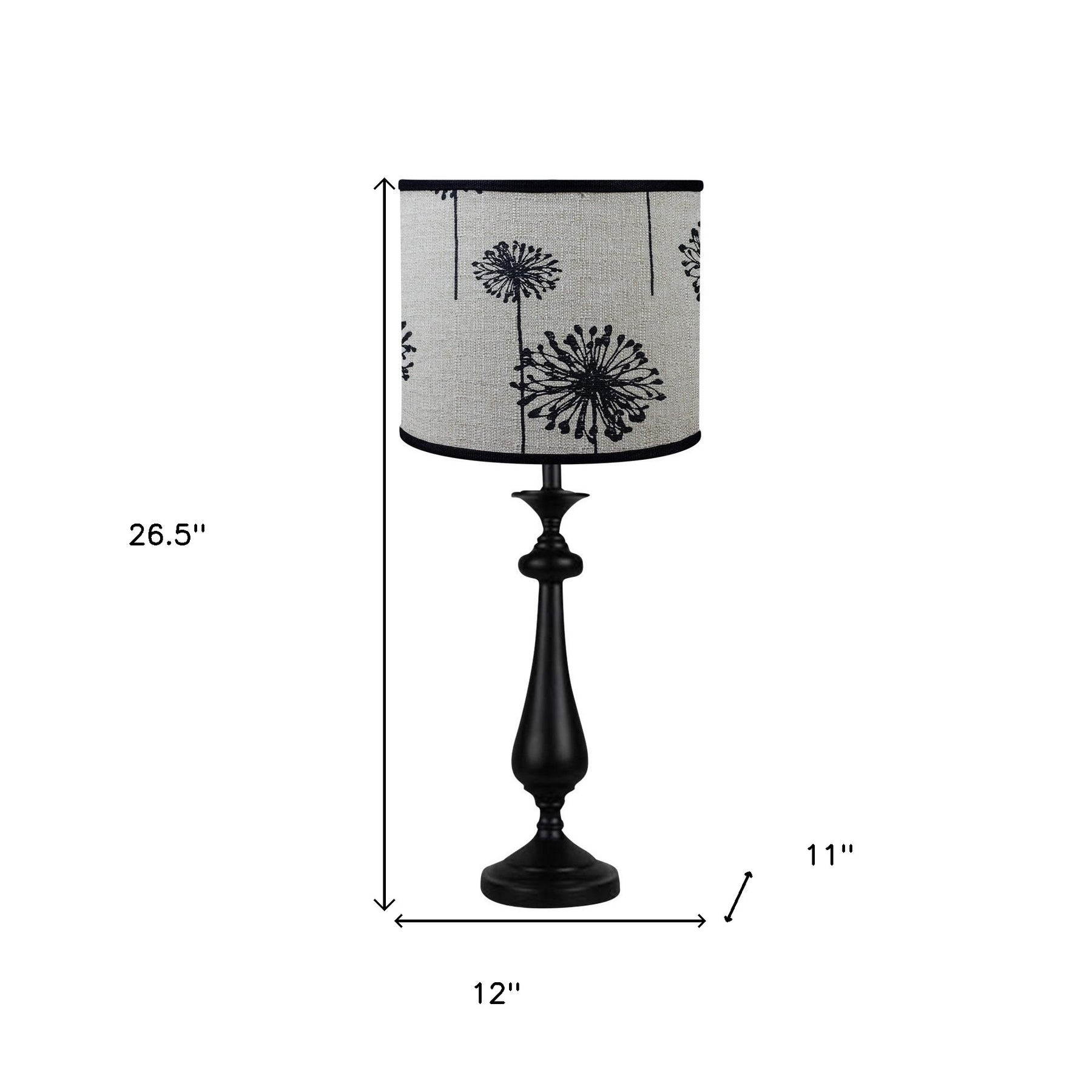 A fashionable twist on a classic, this 26.5"H Black Candlestick Dandelion Shade Table Lamp is an updated and fresh way to light up your space. The traditionally shaped, turned candlestick base pairs nicely with the black and natural linen shade. This lamp not only radiates soft warm light, it becomes a great decorative lamp for your table, desk, or nightstand. The base is constructed of sturdy polyresin and is finished in a modern matte black. 26.5" x 12" x 11".