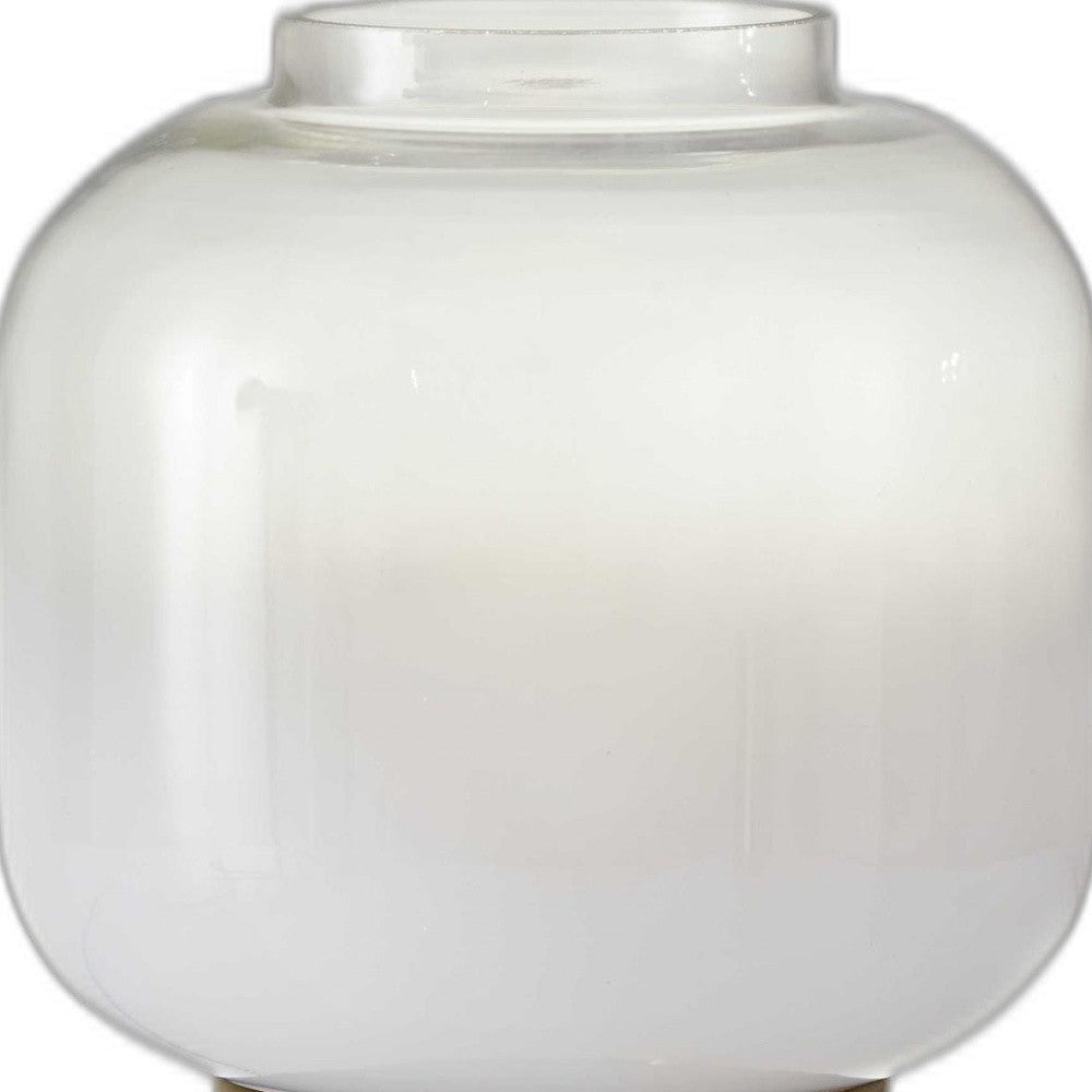 This mod pod table lamp is the perfect accent piece for the bedside or living room. A beautiful glass shade has a white color on the bottom and fades into a clear glass on the top. A large, round knob switch on the antique brass metal base turns the lamp on and off. With a compact silhouette, this decorative accent can also be a great addition to a bookcase or shelf.