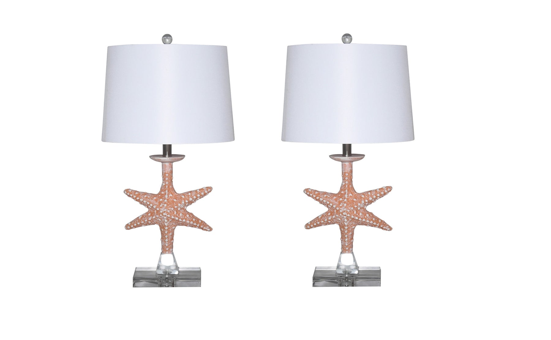 The coastal beauty of this Set of 2 Orange Coastal Starfish Table Lamps is sure to allure the gaze of the beach lovers. Showing off an orange starfish base with white dotted detailing for visual appeal which is placed atop a crystal base and flanks a beautiful white drum shade with a crystal finial. Beautifully crafted with polyresin which is highly durable and shatter-resistant to make this piece last long. Transform the aesthetics of your beach home or coastal décor with this pair of whimsical starfish lamps that will serve as a decorative accent and also offer an attractive lighting solution. 28” H each. Set of 2.