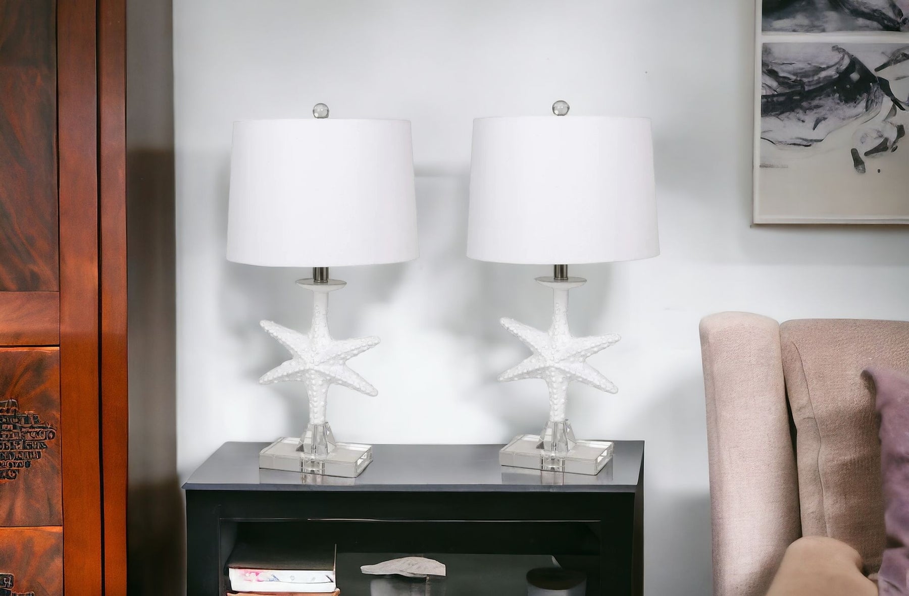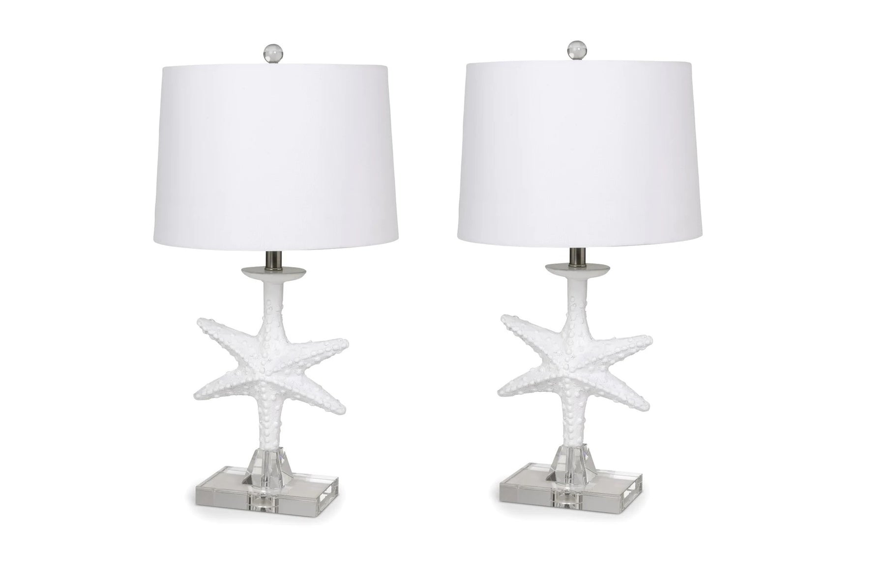 For a home with Coastal Decor or just a beach lover, these White Coastal Starfsh Table Lamps are sure to put a smile on your face. Made of polyresin, the detailed white starfish is distressed and authentic looking, sitting in a fabulous faux crystal base. The crisp and clean look is completed with a white shade and clear top finial. Bring fun beach style and enhance the decor of your home with this 28" tall white coastal starfish table lamp. Set of 2