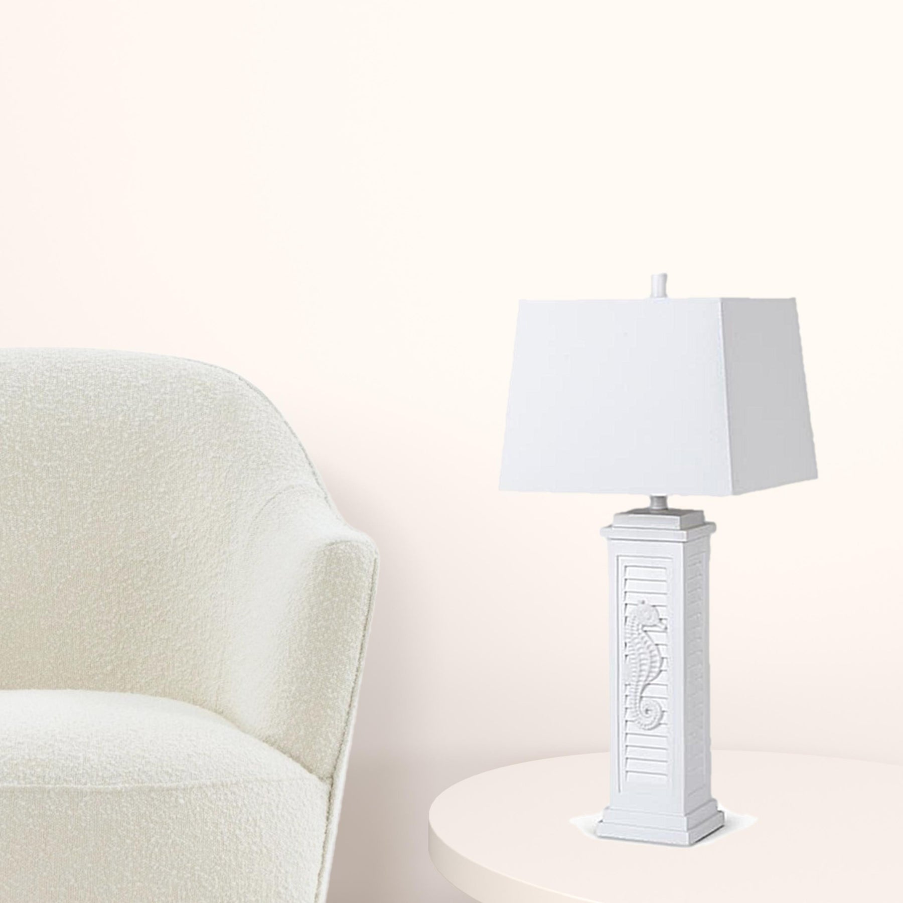 Truly a mix of design and functionality that doesn't compromise on style, this set of two 32" white seahorse shutter USB table lamps with white square shades will be a great addition to your space. The lamp is made of sturdy polyresin and features a white color with a seahorse and plantation shutter motif. USB port helps to keep you connected and charged. This standard table lamp is designed to provide general lighting to the area. Use this lamp anywhere and elevate the look of the whole space. The perfect lamp to create just the right natural and soothing light in your space. 32" H x 5.5" W x 5.5" D