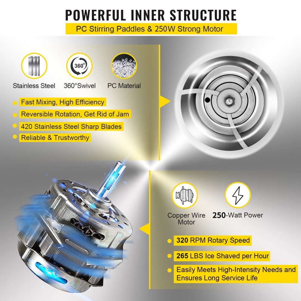 Bring the chill to any event with the VEVOR 110V Electric Shaved Ice Machine. Featuring a robust 250W motor and sharp stainless steel blade, this tabletop snow cone maker can produce up to 265 lbs of shaved ice per hour. Whether you prefer coarse or fine ice, the adjustable texture dial lets you customize it to suit your needs. The compact, user-friendly design and sturdy construction make it perfect for home kitchens, snack bars, parties, and commercial settings like cafés and concession stands. Enjoy refreshing snow cones, slushies, and icy treats anytime with this efficient and reliable ice shaver.