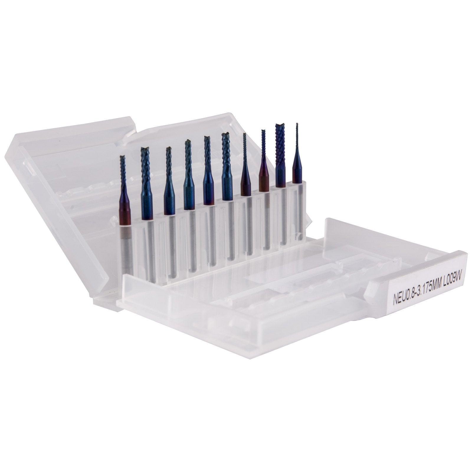 • 10PCs End Mill Kit: Includes bits with cutting edge diameters of 0.8, 1.0, 1.2, 1.4, 1.6, 1.8, 2.0, 2.2, 2.4, and 3.0 mm for versatile use