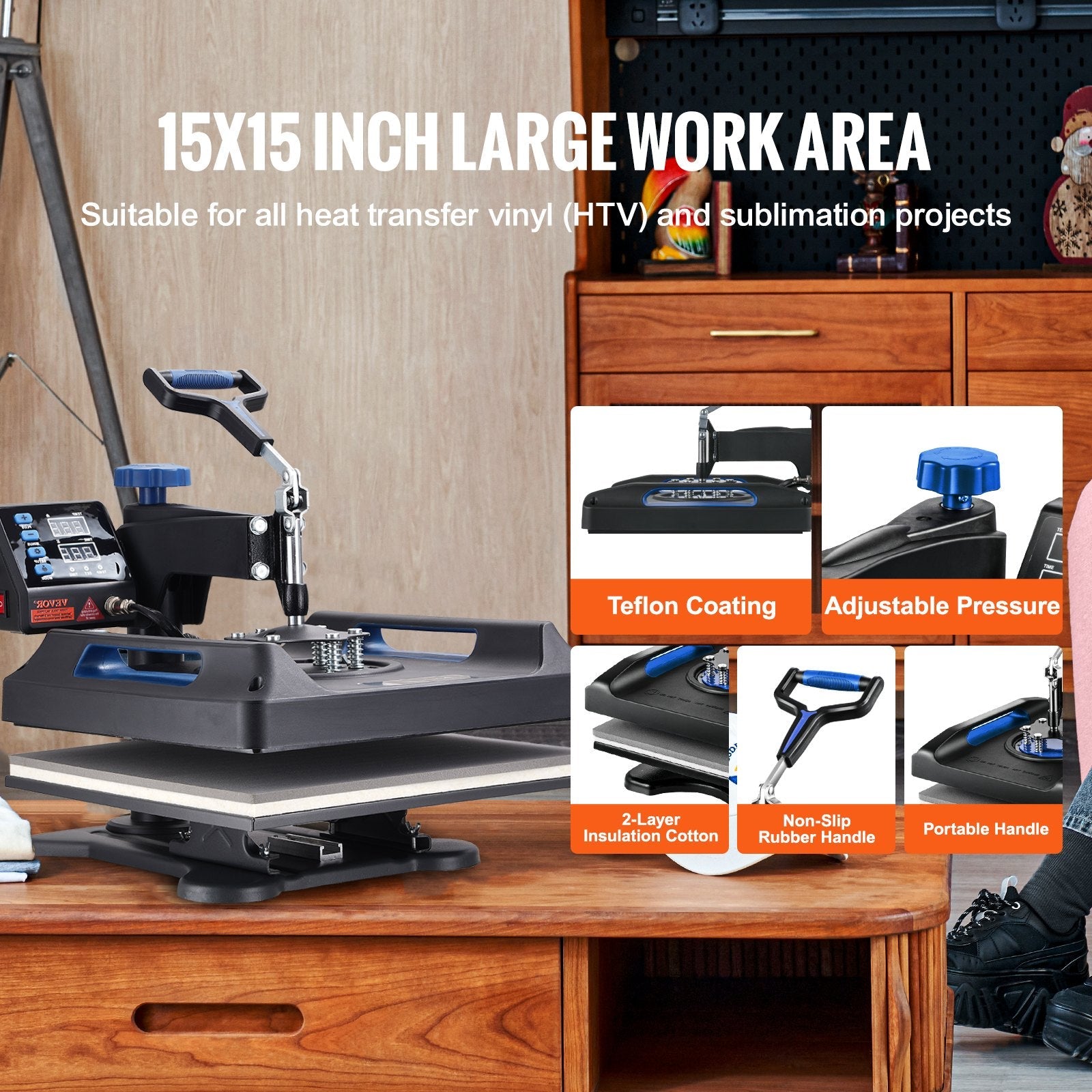 The VEVOR 5-in-1 Heat Press Machine is a highly versatile solution for custom heat transfer applications. With a spacious 15x15-inch heat platen, this multifunctional machine is perfect for transferring vibrant designs onto T-shirts, hats, caps, mugs, and plates. The swing-away arm enhances safety by allowing complete access to the heat platen, reducing the risk of burns. Equipped with a fast-heating element and digital control panel, it offers precise temperature and timer adjustments for consistently professional results. Whether you're crafting at home or managing a small business, this heat press ensures high-quality output across a variety of projects.