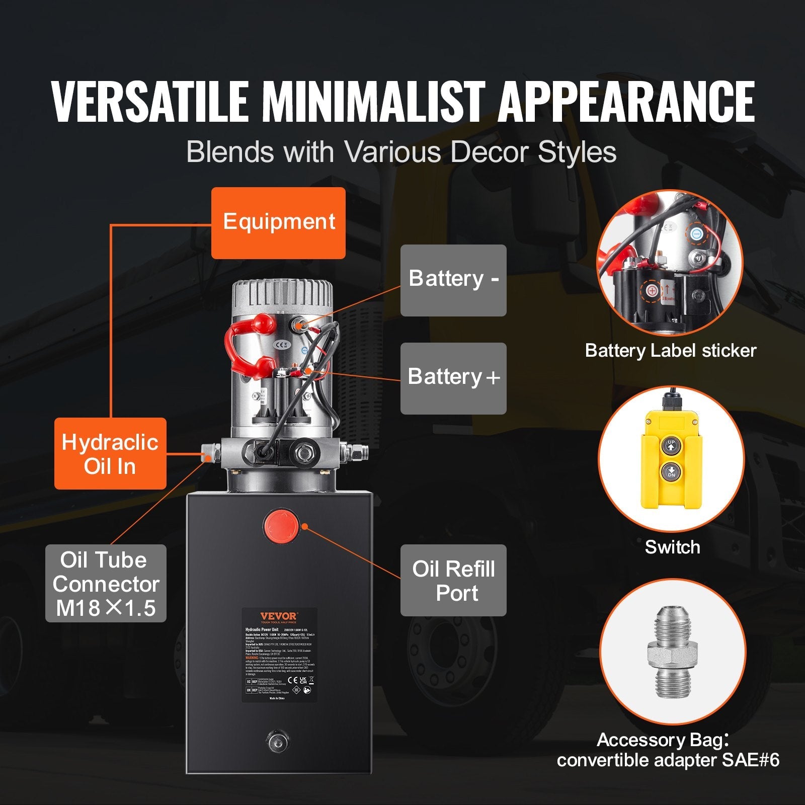 Power your dump trailers and lifting systems with ease using the VEVOR 12 Quart Hydraulic Pump. This single-acting unit delivers 0.91 GPM at 3200 PSI max pressure, offering strong, steady performance for heavy-duty hydraulic tasks. Designed for durability and quick setup, it's ideal for dump trailers, car lifts, and agricultural machinery.