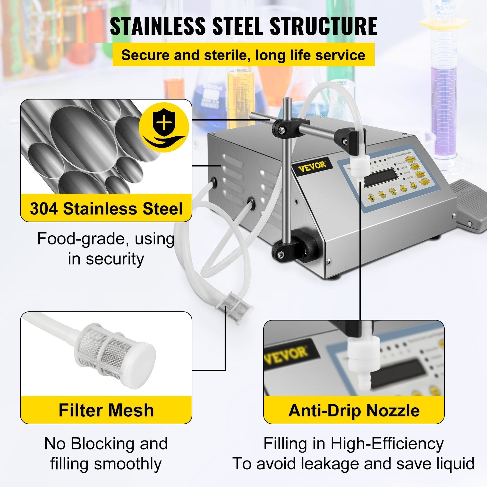 The VEVOR Liquid Filling Machine GFK160 is a high-efficiency, digitally controlled pump filler designed for precise liquid dispensing. With a wide filling range from 2 to 3500 ml, it accurately fills bottles and containers of various sizes. The advanced digital control system offers easy and precise adjustments to ensure consistent output, making it perfect for industries such as pharmaceuticals, food and beverage, and cosmetics. This machine streamlines your bottling process with reliable performance and user-friendly operation.