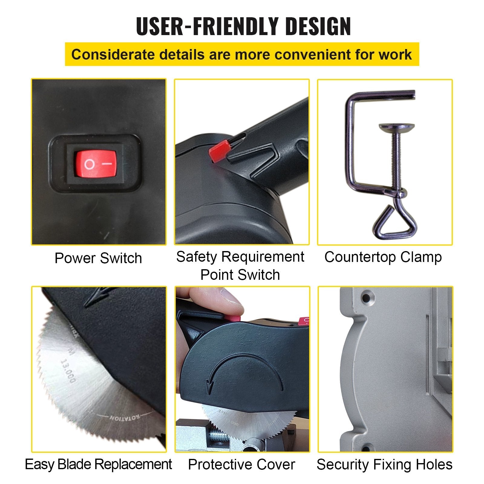 Precision meets portability with the VEVOR Mini Miter Cut-Off Chop Saw. Designed for hobbyists and DIYers, this compact benchtop saw features two 2-5/16" blades—steel and resin—for cutting a variety of materials including copper, aluminum, wood, and zinc. Its powerful 90W motor reaches speeds of up to 7800 RPM, while the 0–45° adjustable miter scale enables precise angled cuts. Lightweight and easy to carry, this saw is perfect for crafts, small projects, and light-duty metalwork. A great tool for anyone who values accuracy and versatility in a small workspace.
