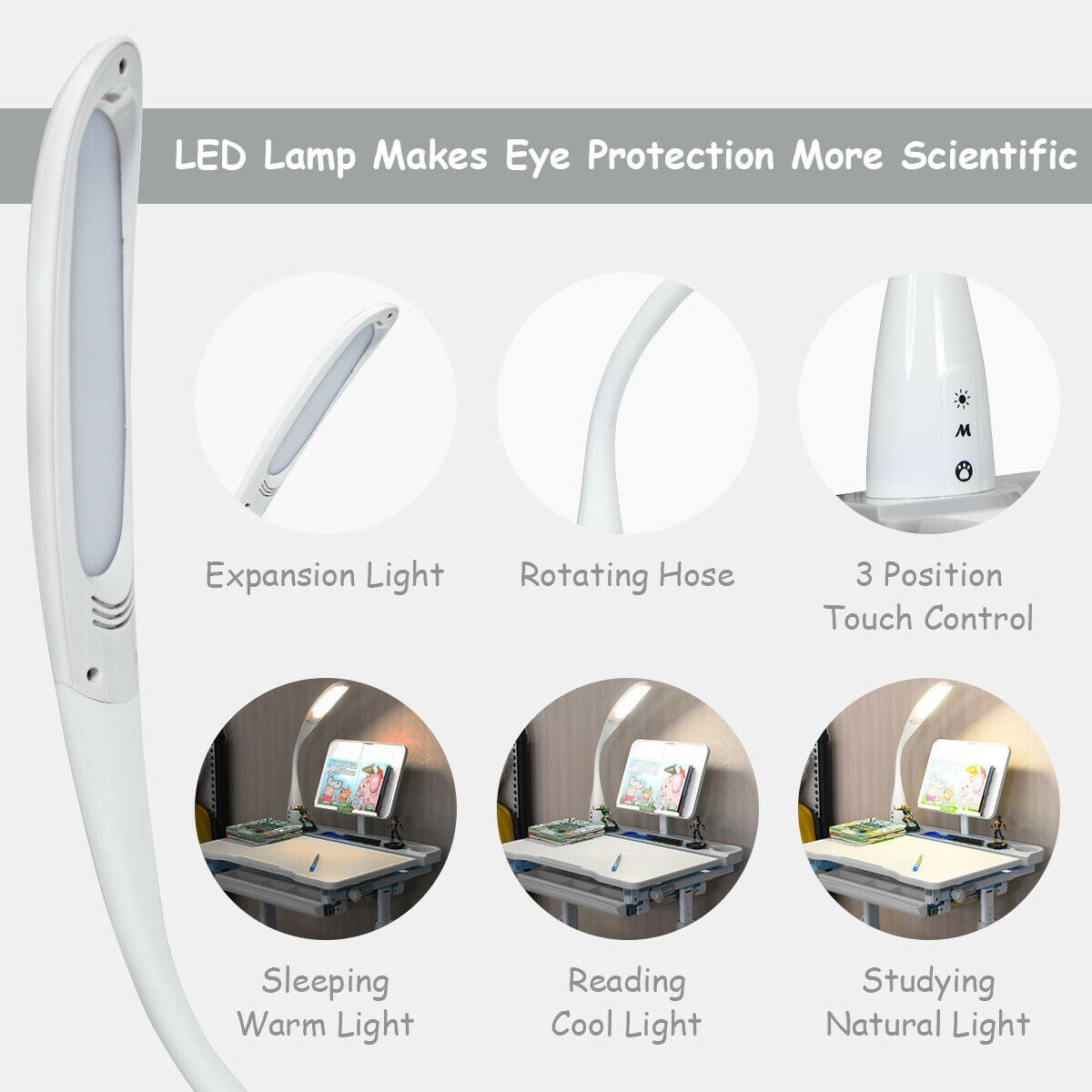 Tilted Desktop with Anti-Pinch Stopper: The desk surface tilts from 0° to 40°, providing the best angle for writing, reading, and drawing. Anti-pinch stoppers protect fingers from getting caught when adjusting the desktop angle.