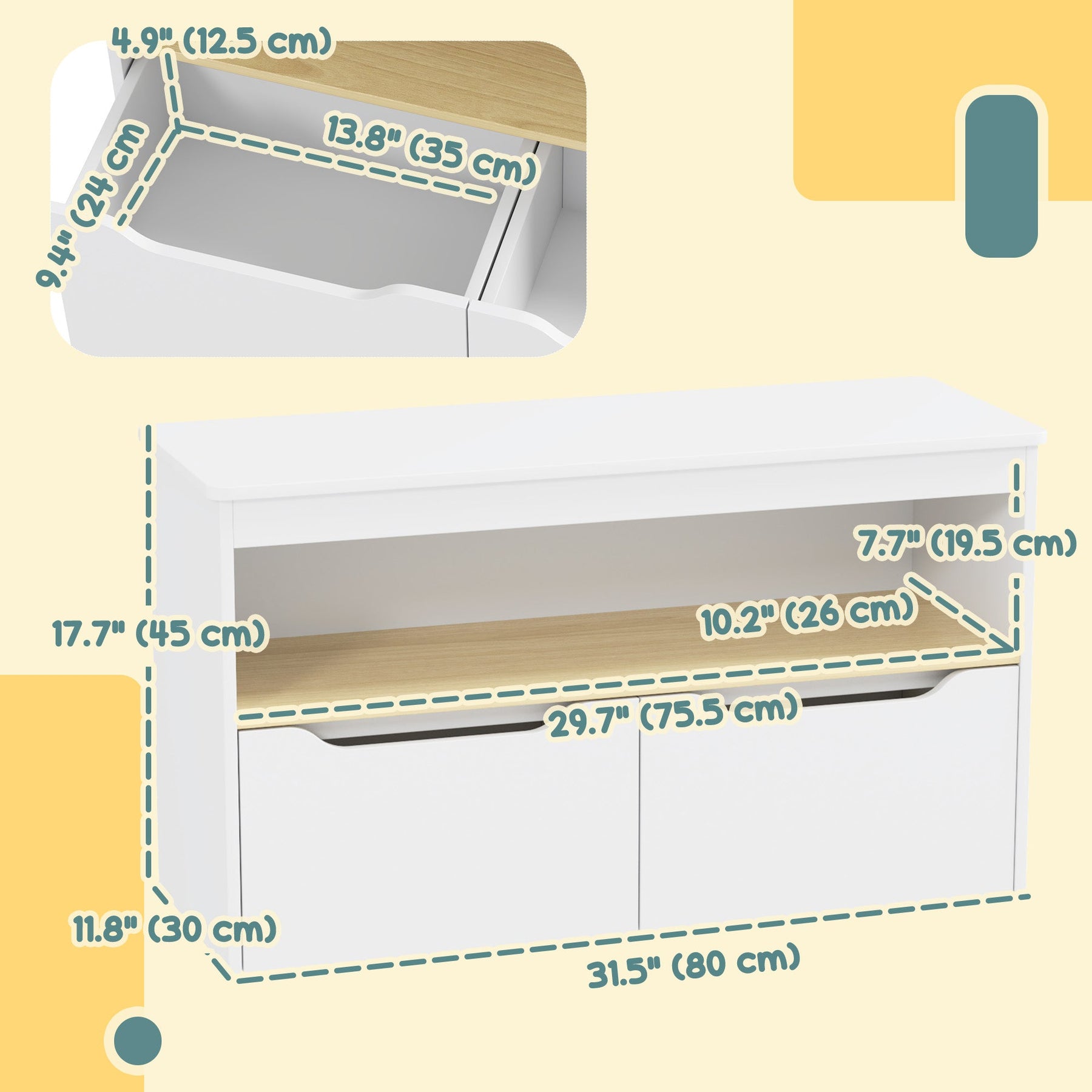 Overall dimensions: 31.5"L x 11.8"W x 17.7"H (80L x 30W x 45H cm)