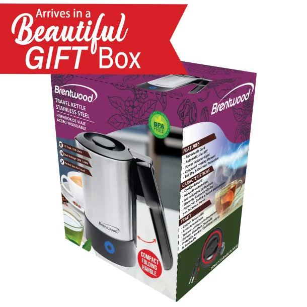 The Brentwood® KT-1506S Electric Travel Kettle is designed for on-the-go convenience and efficiency, perfect for frequent travelers. With a 1000-watt power output, this 20-ounce kettle quickly boils water, whether you're at home or abroad. Featuring dual-voltage compatibility, it operates worldwide, making it ideal for international travel. The high-quality stainless steel construction ensures durability and longevity, while the automatic shutoff feature offers added safety by turning the kettle off once the water has boiled. Compact and portable, this travel kettle is an essential for quick hot beverages and efficient boiling during your travels.