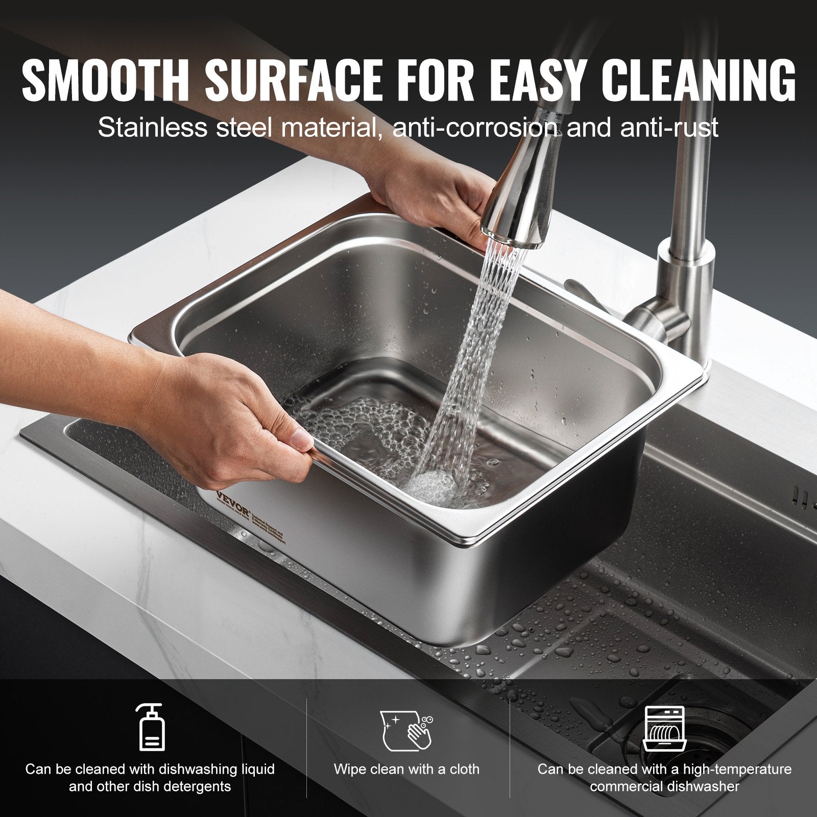 Upgrade your food service setup with the VEVOR 8 Pack 1/2 Size Hotel Pans with Lids. These 4-inch deep commercial steam table pans are crafted from premium 201 stainless steel with a robust 0.8mm thickness for long-lasting durability. Designed with anti-jam stacking for easy separation and storage, each pan holds up to 6.25 liters (6.6 quarts), making them perfect for hot or cold food storage in buffets, catering services, restaurants, or industrial kitchens. Resistant to rust, warping, and corrosion, these pans are built to endure repeated use in high-volume environments while remaining easy to clean and safe for food contact.