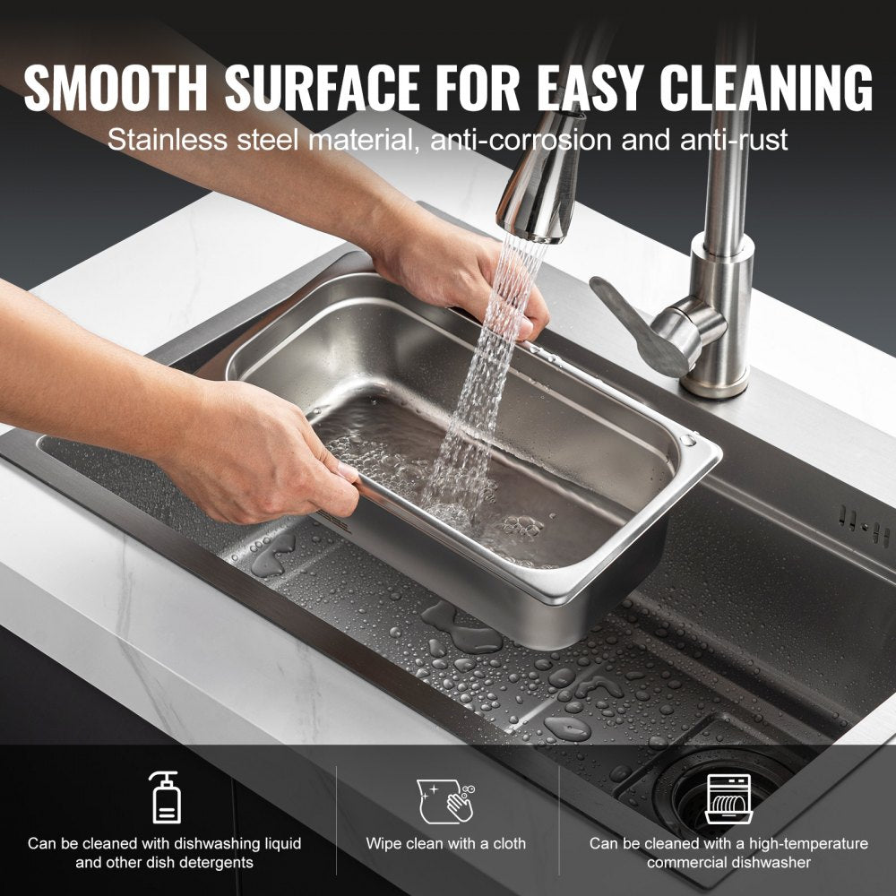 Upgrade your commercial kitchen with the VEVOR 8 Pack 1/3 Size Hotel Pans—an essential solution for catering, buffet setups, and food service operations. Each steam table pan is made from durable 0.8mm thick 201 stainless steel, ensuring long-lasting performance even under intense use. With a generous 6.3 QT (5.93L) capacity and 6-inch depth, these pans are perfect for storing, heating, or serving large batches of food. The anti-jam design allows for easy stacking, and the included lids help keep contents secure and hygienic. Whether you're running a restaurant or preparing for an event, these pans are built to handle it all.