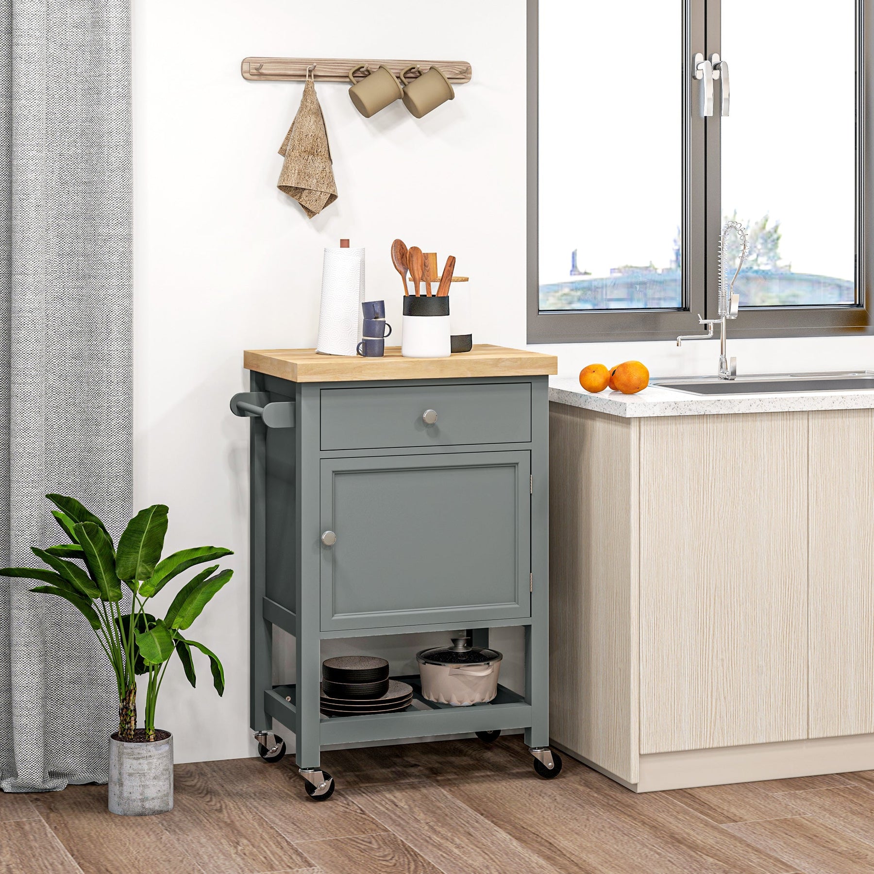 This compact kitchen island cart is the perfect addition to any kitchen, offering versatile storage and a sleek, modern design. Featuring a spacious drawer, an enclosed cabinet, and a bottom open shelf with an attached towel rack, this cart provides ample space for kitchen utensils, food supplies, or home accessories. The butcher block top is crafted from 1.1" (2.8 cm) thick rubberwood, providing a durable and easy-to-clean surface for meal prep. The natural wood grain finish enhances the cart's elegance and adds warmth to your kitchen. Its four smooth-rolling caster wheels allow for easy mobility, while two locking casters ensure stability when needed. The towel rack also doubles as a transport handle for added convenience.