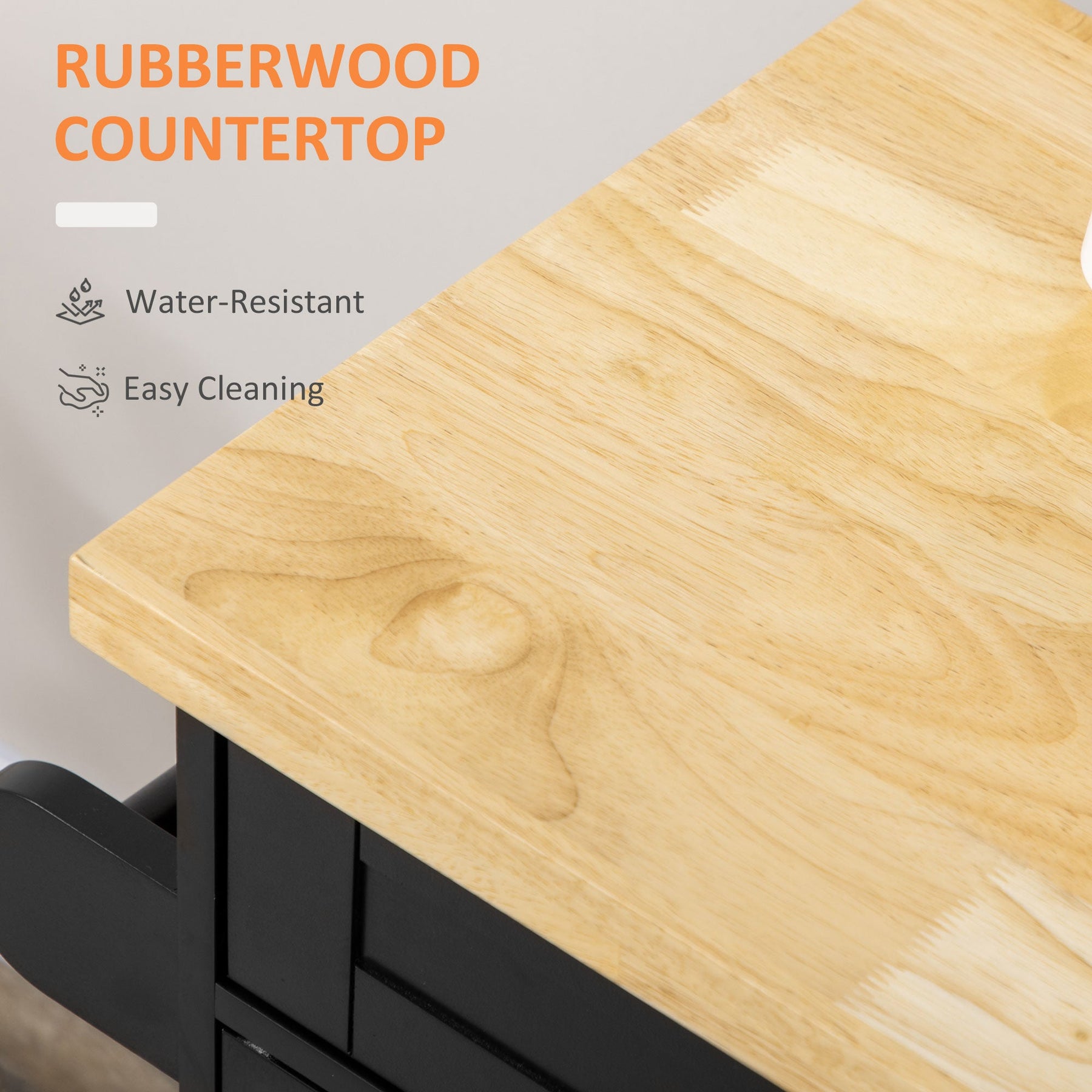 Wheeled Customizable Workspace: Spacious rubber wood tabletop for food preparation and cooking, with mobility thanks to four casters (two with locks).