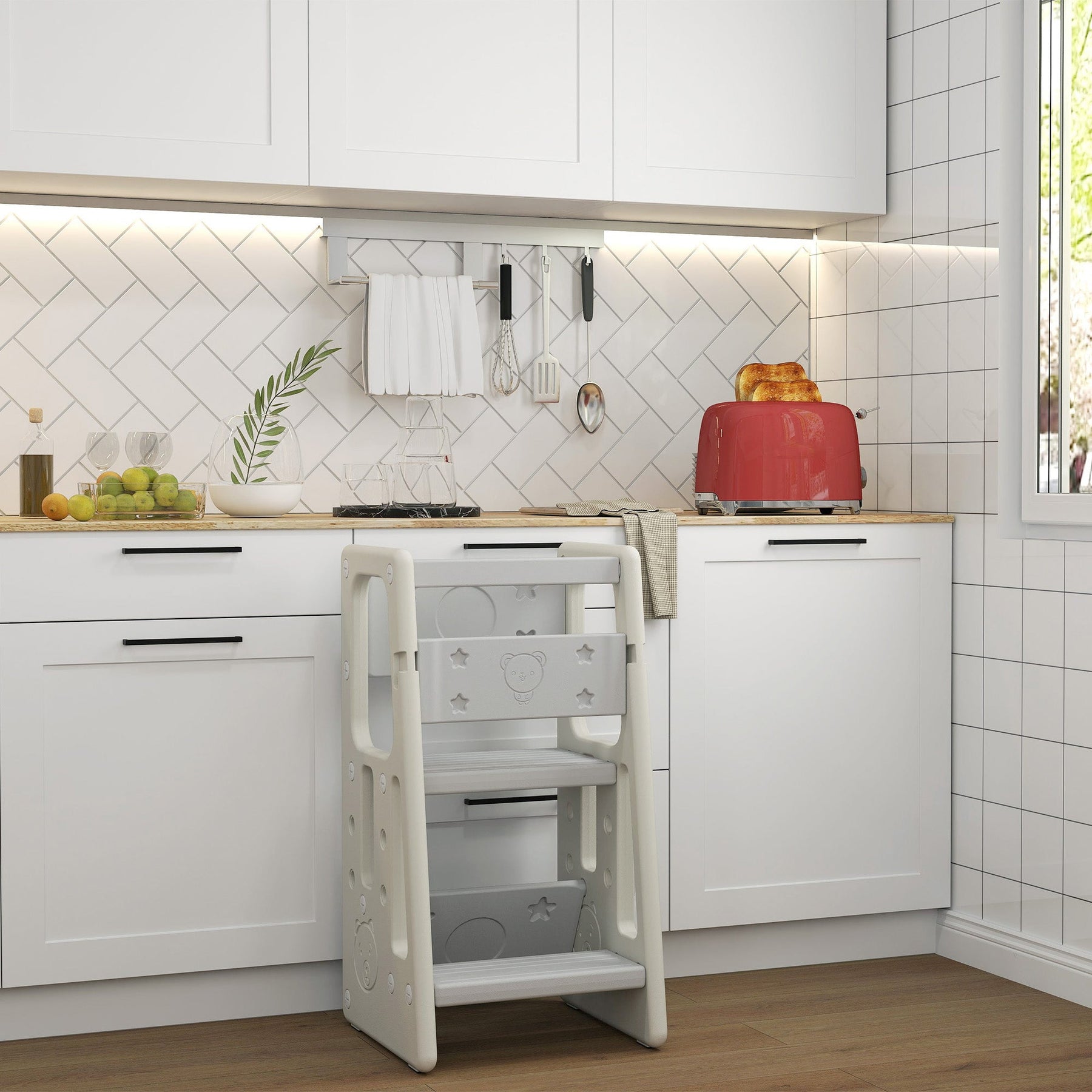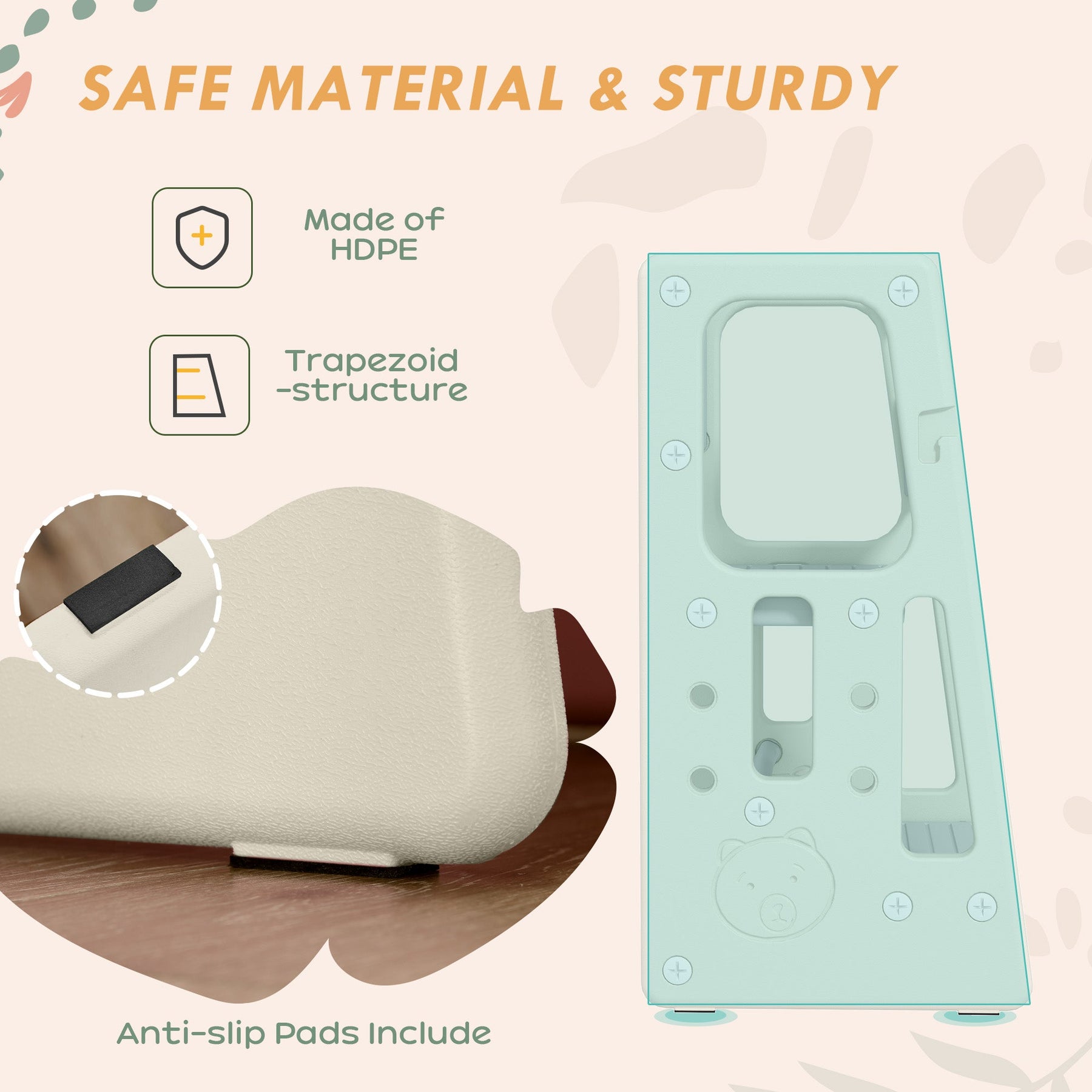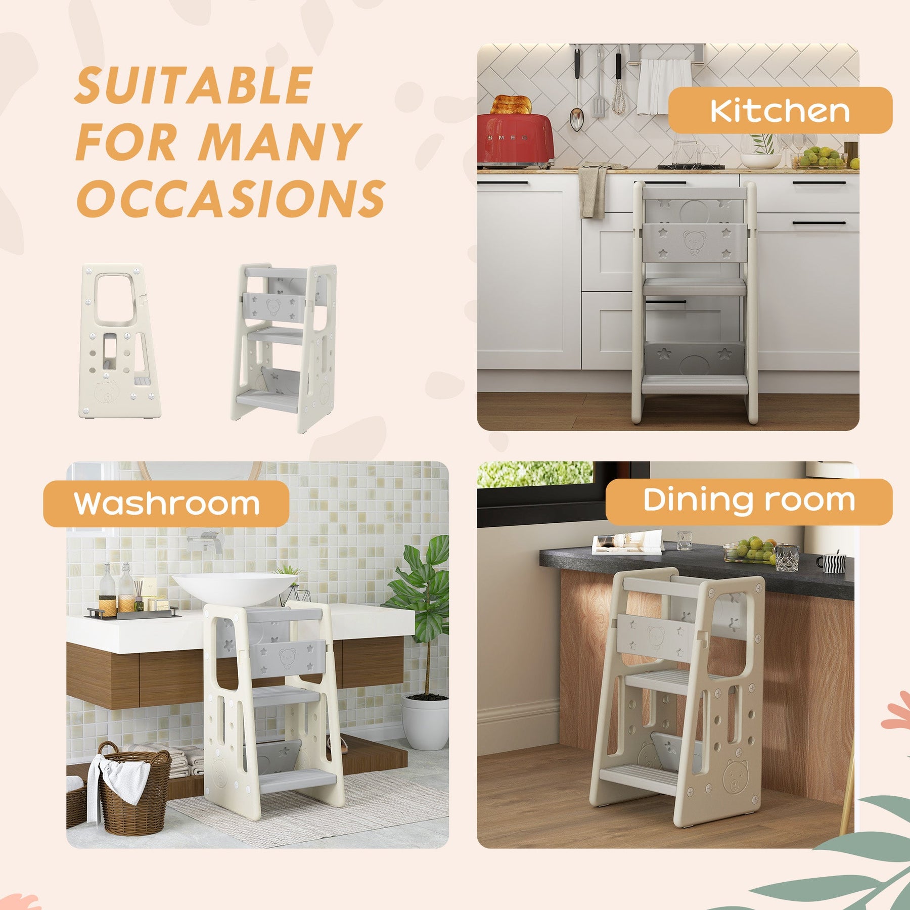 This adjustable toddler kitchen stool helper is designed to provide your child with a safe and stable platform to explore and engage in everyday activities. With 3 removable platform levels, it can be customized to fit your child’s height as they grow, offering a perfect solution for toddlers eager to lend a hand in the kitchen or other areas of the home. Made from nontoxic HDPE material, the tower is odor-free and safe for your child’s use. The trapezoid structure ensures stability, while the protective guardrails and handrails provide support and prevent accidental falls. With a non-slip mat at the base, the stool remains securely in place, offering peace of mind in various settings, including kitchens, washrooms, and dining rooms. This practical and durable stool helps cultivate independence in children, encouraging them to actively participate in daily routines.