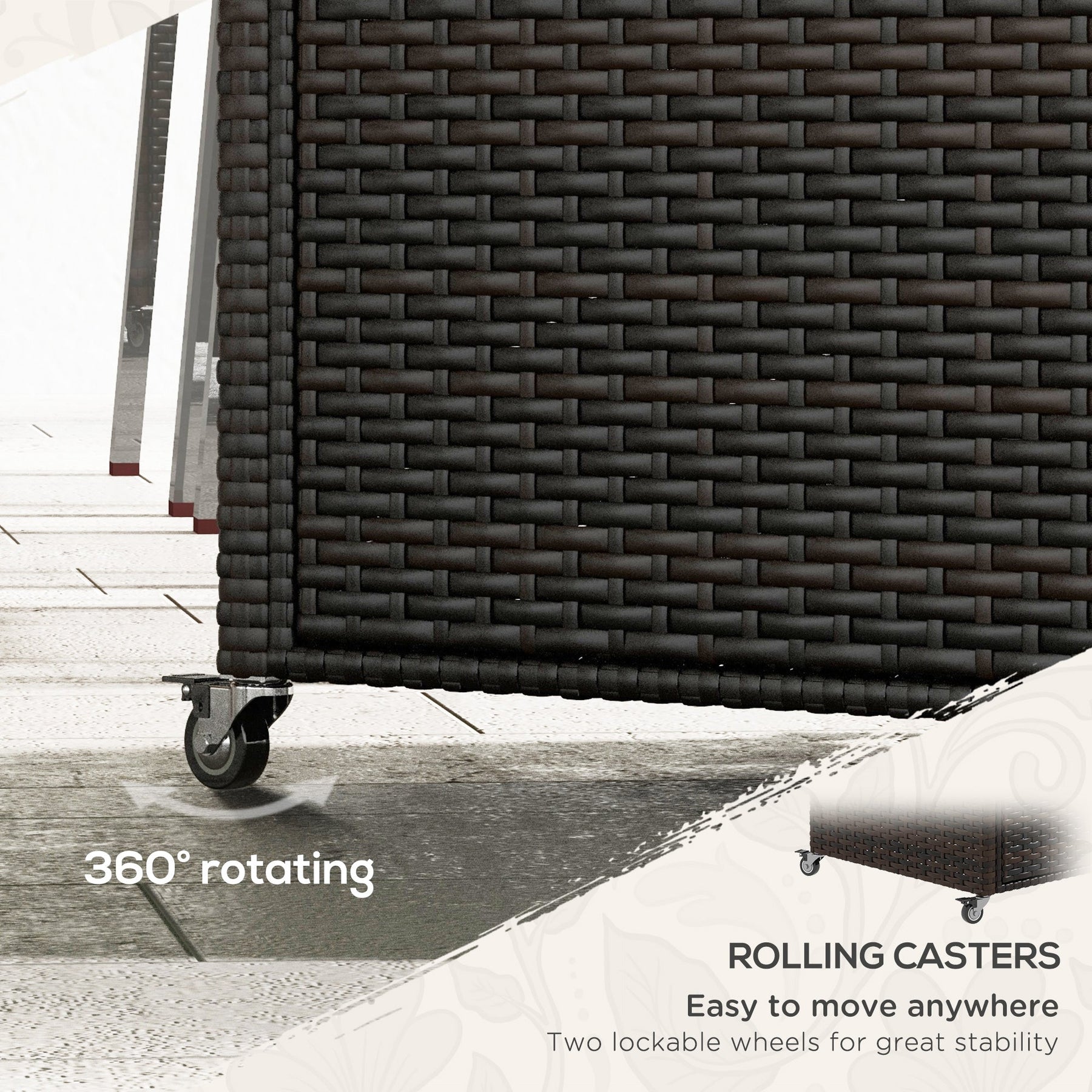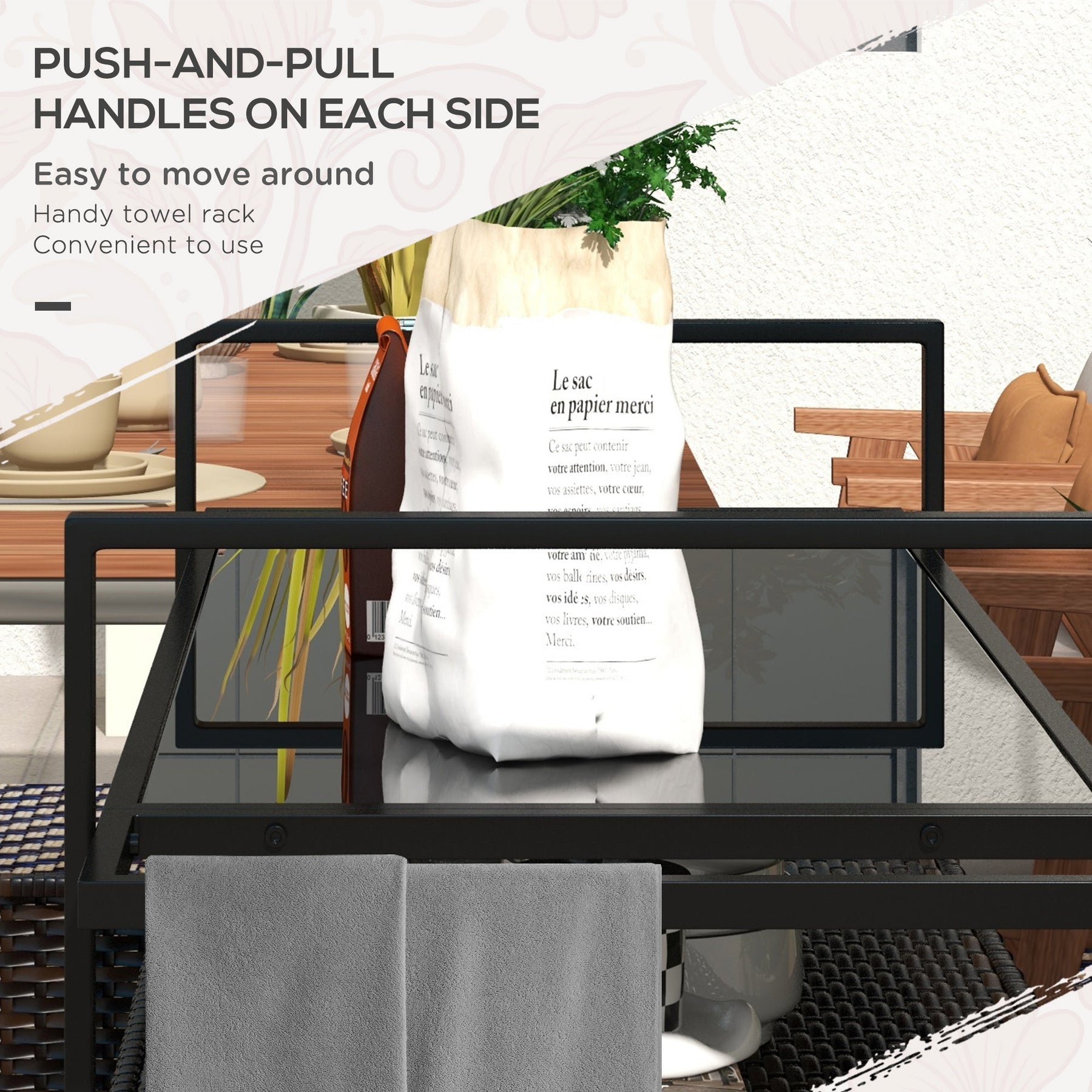 Bring the comforts of your indoor kitchen to the outdoors with this Patio Bar Cart with Table & Storage. Designed for versatility, this mobile kitchen island features a black tempered glass surface, a convenient second layer, and a two-door cabinet for ample storage, perfect for holding cleaning supplies, towels, and extra items. The cart with brakes allows for easy mobility; simply lift the handles to roll it around your patio or garden, and lock the wheels when you need it to stay in place. The handles double as towel racks, offering added convenience for outdoor dining and entertaining. The PE rattan exterior, which is more durable and weather-resistant than traditional wicker, gives this bar cart a tropical flair, while the powder-coated steel frame ensures it's built to withstand the outdoor elements. Whether you're serving drinks, preparing food, or just enjoying a meal with friends, this outdoor bar cart will enhance your dining experience.