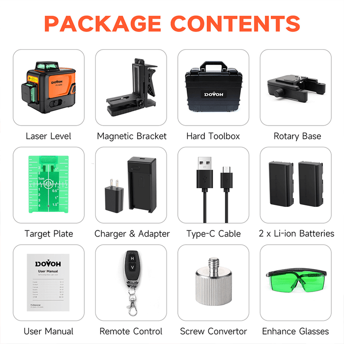 The Dovoh P3-360G 3x360 Green Self-Leveling Laser Level provides unmatched precision and visibility for both professional and DIY applications. Featuring three 360° laser lines, this tool ensures complete coverage, perfect for floor leveling, tile installations, wall alignment, and general construction work. The green laser technology offers enhanced brightness for clear visibility, even in well-lit conditions, making it ideal for indoor and outdoor tasks. The self-leveling function ensures that the laser lines are always accurate, saving you time and effort in complex leveling tasks. Compact, durable, and easy to use, the Dovoh P3-360G is a must-have tool for any project requiring flawless alignment.
