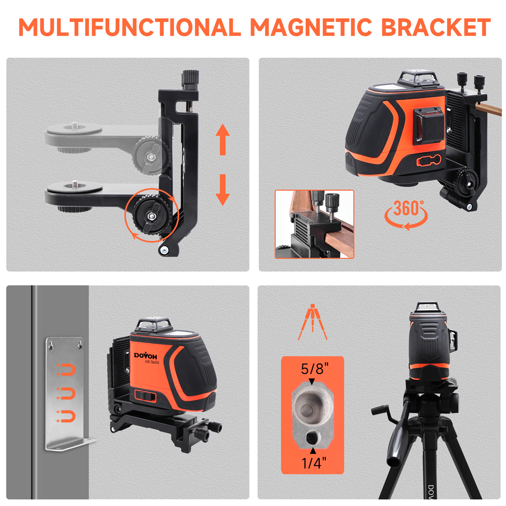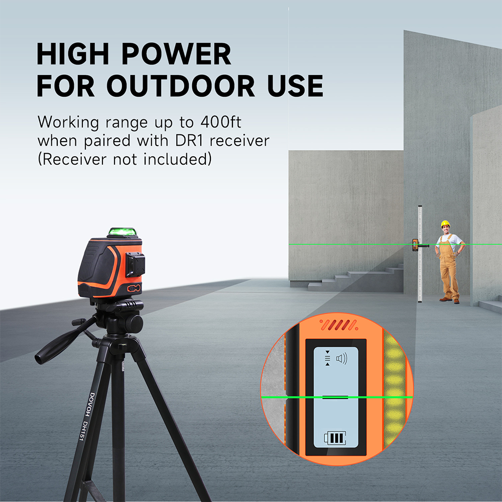 The Dovoh H3-360G Ultra-Bright Outdoor Laser Level with 3x360° provides exceptional precision and visibility for outdoor and large-scale projects. Equipped with three 360° laser lines, this tool delivers comprehensive leveling coverage, making it perfect for applications like landscaping, building construction, and outdoor installations. The green laser technology ensures enhanced brightness, providing clear and visible beams even under bright sunlight. Whether you're setting up fences, foundations, or other outdoor structures, the Dovoh H3-360G guarantees accuracy and reliability. Its rugged design and advanced features make it the perfect choice for both professionals and DIY enthusiasts working in demanding environments.