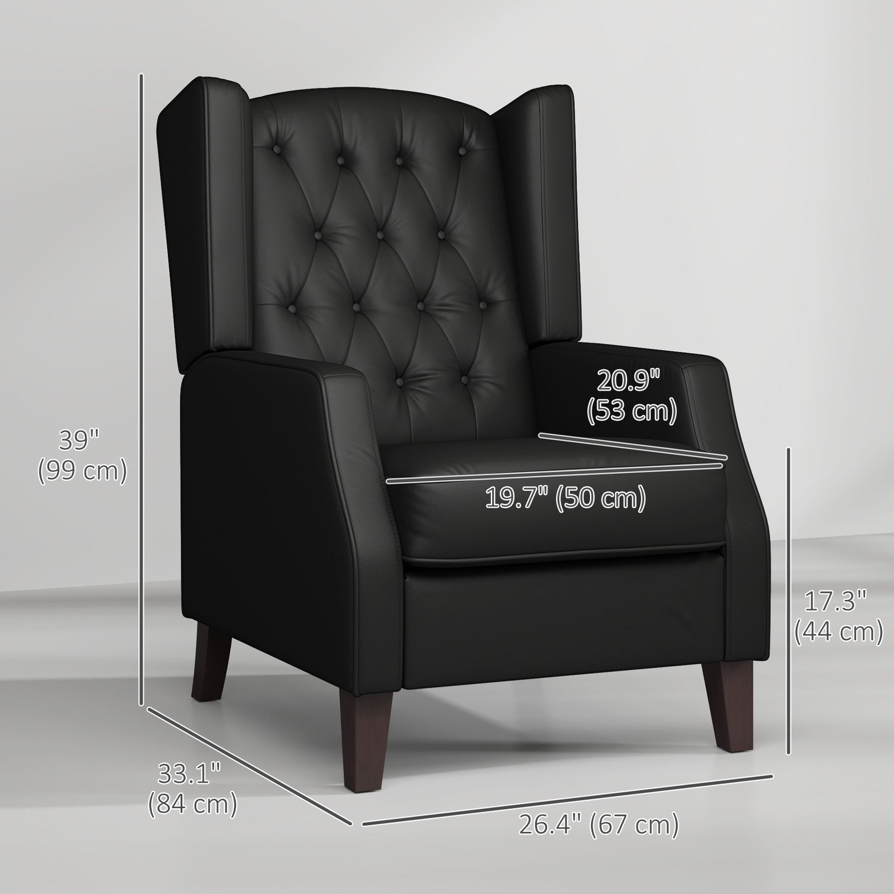 This modern accent chair is designed to add both comfort and style to any room in your home. With its clean lines and elegant button tufting on the wingback, it stands as an impressive piece of furniture that complements any decor. The soft PU leather surface and well-padded seat, which includes a spring pack for added support, ensure you enjoy exceptional comfort as you relax. The chair’s robust structure, crafted from a multi-layer board frame, can support up to 330 lbs (150 kg), making it a durable and reliable piece for any living space. Whether placed in a private corner of your bedroom for some quiet relaxation with a book or a cup of tea, or used as additional seating in your living room for social gatherings, this versatile chair is sure to elevate the style and comfort of your home. The overall dimensions are 26.4" W x 33.1" D x 39" H (67 x 84 x 99 cm), and the chair has a weight capacity of 330 lbs (150 kg). Assembly is required.