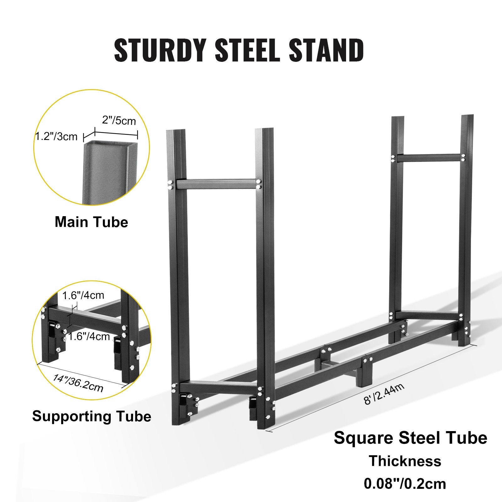 Organize and protect your firewood with the VEVOR Firewood Log Rack, a sturdy and spacious storage solution designed for outdoor use. Measuring 8 feet long, this durable black steel rack can hold up to 1300 lbs of firewood, keeping your logs neatly stacked and off the ground. The included weather-resistant cover shields your firewood from rain and snow, ensuring dry, ready-to-burn logs year-round. For added convenience, the rack also comes with a fireplace tool set, making it a complete solution for firewood storage and fireplace maintenance.