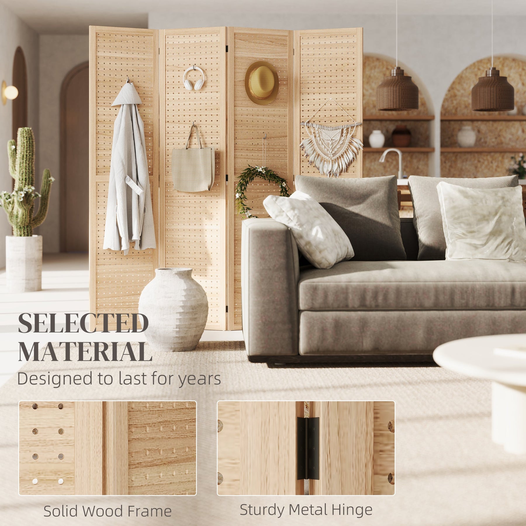 Enhance your living space with this stylish 4-panel room divider, designed to provide instant privacy while adding a touch of natural charm to any room. Whether used in your living room, bedroom, home office, or even a larger open space, this divider helps create smaller, enclosed areas. The solid wood frame not only ensures sturdiness but also brings a warm, organic feel to your décor. With 500 pegboard holes per panel, this divider offers unique customization potential, allowing you to add hooks or decorative elements to suit your style. The design also maintains optimal ventilation and translucency, creating a bright, airy ambiance while offering the privacy you need. Made with solid wood and featuring 9 metal hinges for easy folding and unfolding, this privacy wall is both robust and smooth. It’s easy to store when not in use, simply folding down to a compact size for convenient storage. With no assembly required, this room divider is ready to use straight out of the box.