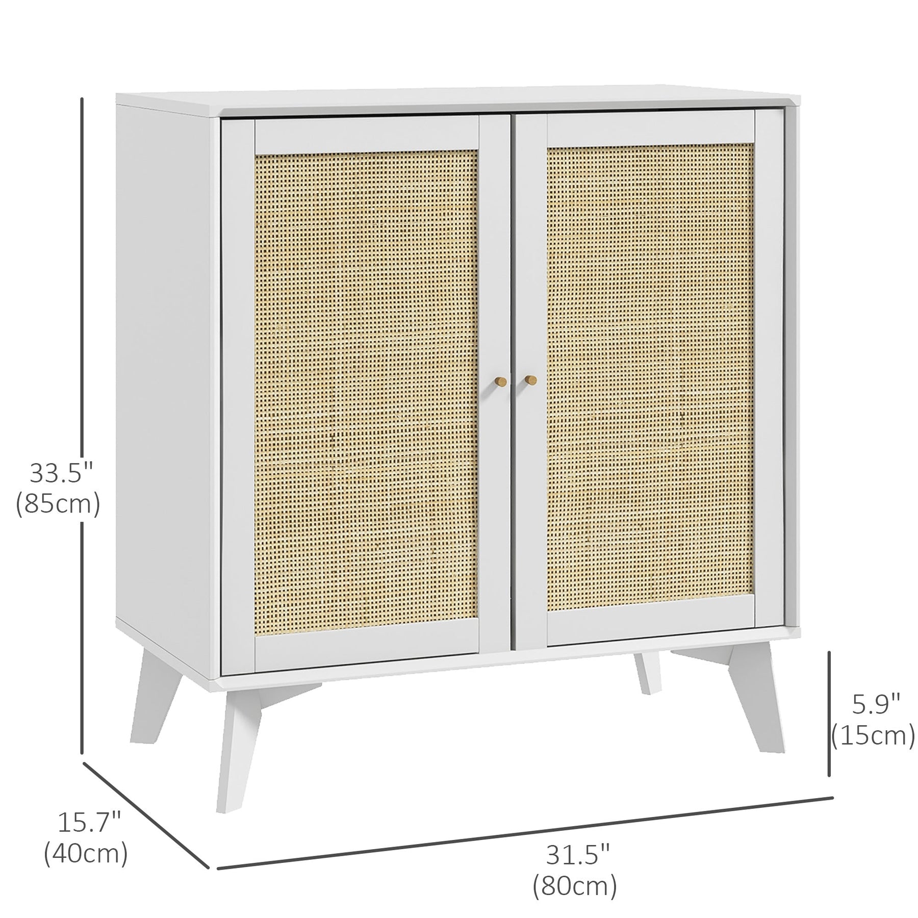 Add a touch of Boho charm to your home with this accent cabinet, featuring a pure color surface and hand-woven rattan door front. Perfect for use as a sideboard or bar cabinet in the dining area, or as an entryway piece for to-go essentials. This versatile buffet cabinet offers ample storage space with its 2-tier inner shelves, providing plenty of room for dishes, pots and pans, glasses, books, and more. The two doors keep your items safe and dust-free, while the wooden knobs and quality metal hinges ensure smooth opening and closing. The adjustable shelf allows for customizable organization with three adjustable positions to accommodate items of various sizes. Built with a sturdy structure made from particleboard and MDF, this cabinet is designed for reliable use and stability. The anti-tipping design adds safety, making it a perfect addition to any home.