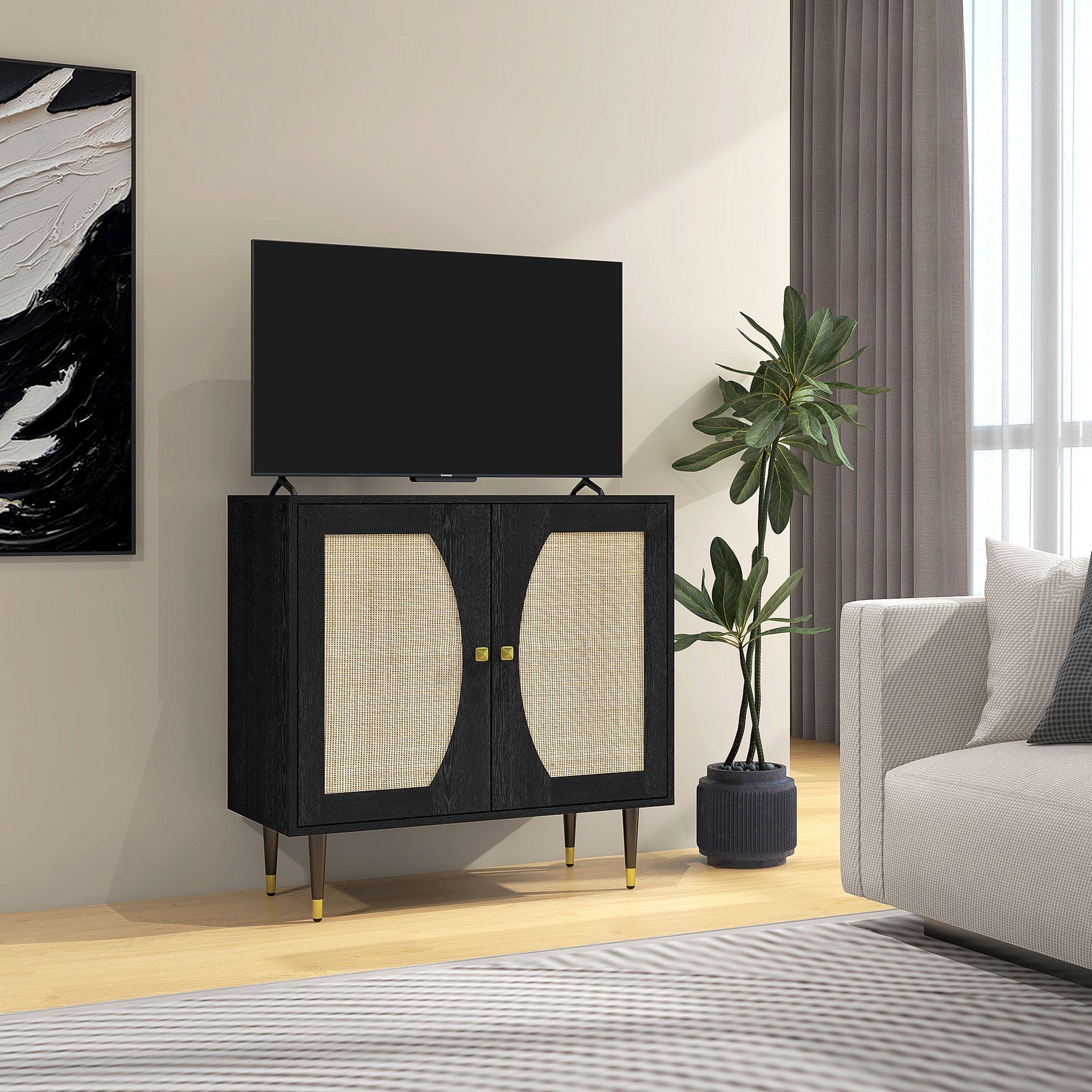 This stylish kitchen or living room cabinet combines modern functionality with Bohemian flair. The symmetrical rattan door fronts, finished in black with gold accents, offer a unique design that adds both texture and breathability to the room. Perfect as a TV stand, this piece can support up to a 42-inch television, seamlessly blending form and function. Inside the floor cabinet, a 3-level adjustable shelf, with spacing of 2.5 inches (6.4 cm) between each, provides ample space for storing a variety of items. Crafted with melamine-coated particleboard and sturdy legs, this buffet cabinet is easy to maintain and designed for durability. The anti-tipping feature ensures stability, making it a safe and stylish addition to any room.