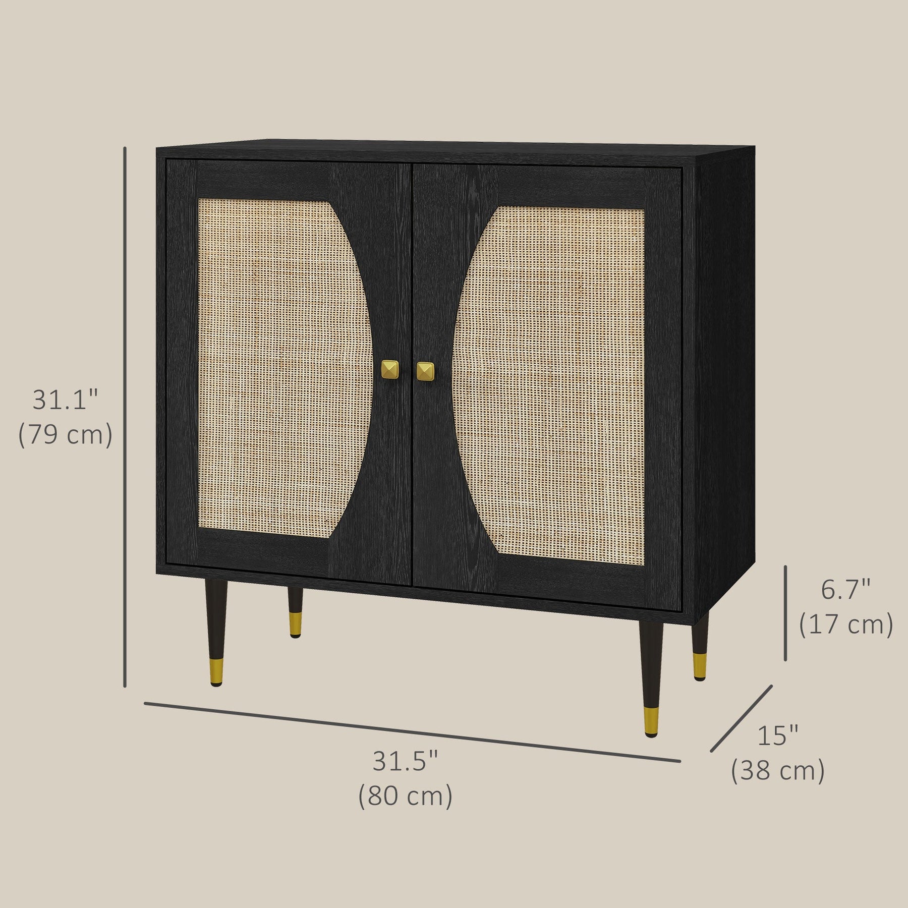 • Bohemian Design: Symmetrical rattan door fronts with black finish and gold accents add a chic, breathable touch to the room.