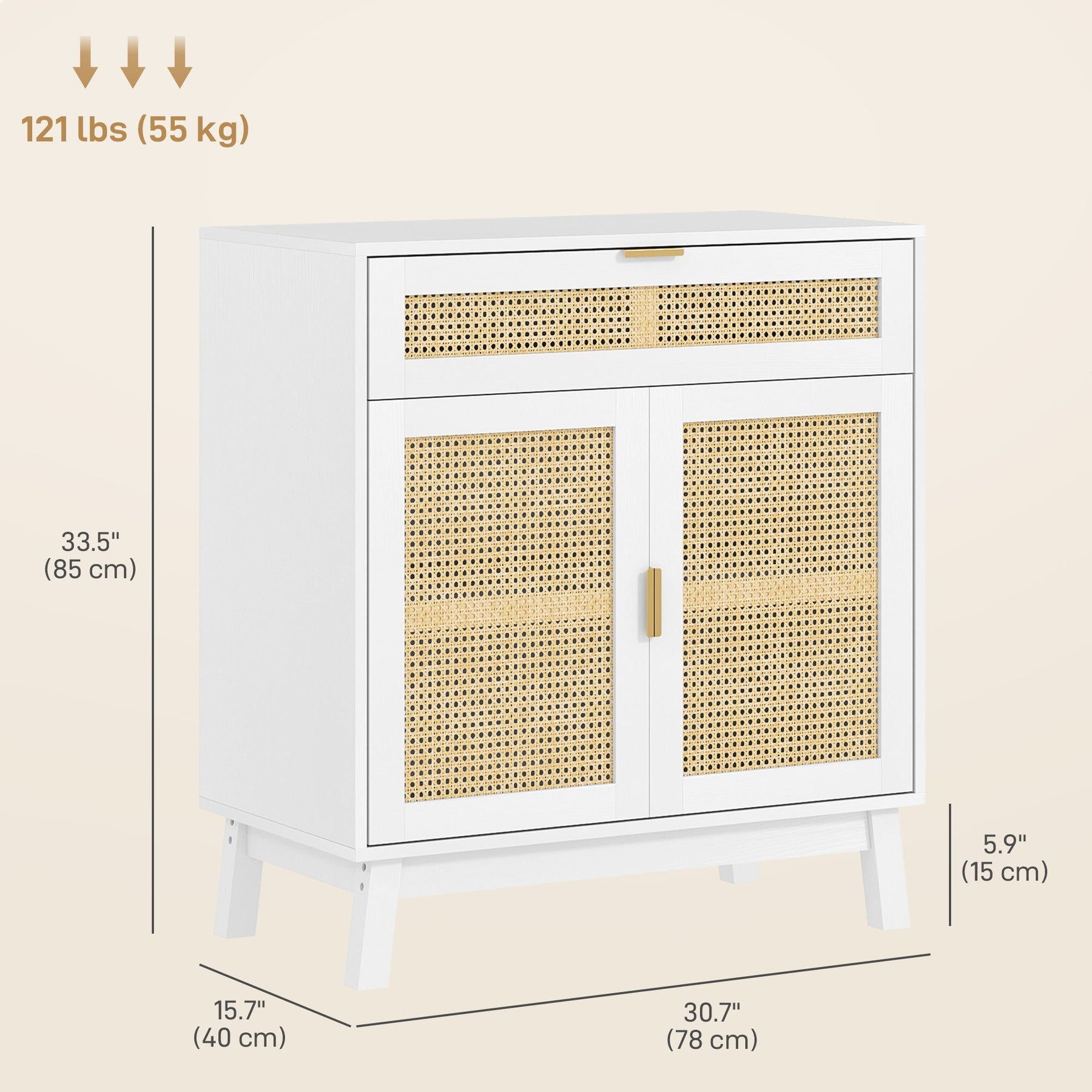 Bring an elegant touch to your home with this boho-style accent cabinet. Featuring rattan doors and chic aluminum golden handles, this buffet cabinet combines practicality with a stylish design. It offers spacious storage with a large drawer and a roomy cabinet to neatly organize your essentials, including toiletries, cleaning supplies, tableware, and kitchenware. The kitchen cabinet also includes a three-position adjustable shelf, making it versatile for storing items of varying sizes. Thoughtfully designed with elevated legs for better ventilation and an anti-tipping feature for safety, this coffee bar is perfect for any room. Easy to assemble and highly functional, it adds a charming element to your home décor.
