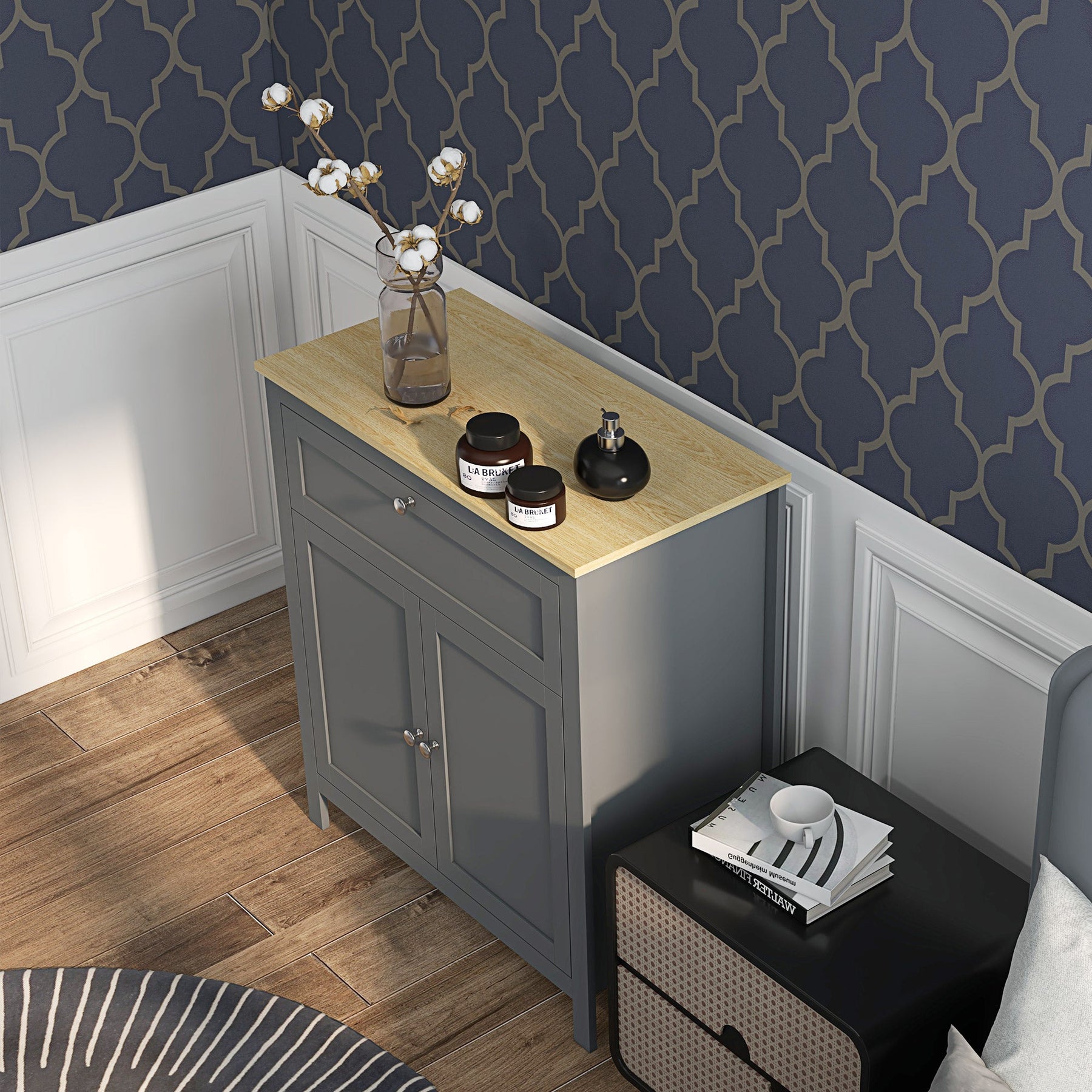 This modern kitchen storage cabinet combines simplicity with style, featuring a natural wood grain top, white clean lines, and recessed door panels to seamlessly enhance any room's décor. With a sliding rail drawer and a 2-tier door cabinet, it offers ample closed storage to keep your home organized. The cabinet also includes a 3-level adjustable shelf inside, providing flexible storage options to meet various needs. Whether used as a sideboard to store pans and dishes, a storage unit for collections, or a hallway cabinet for everyday essentials, it adapts to your space effortlessly. Crafted from durable painted particleboard, this buffet cabinet ensures sturdiness and is easy to clean. An anti-tipping design and foot pads add extra safety and stability for peace of mind.
