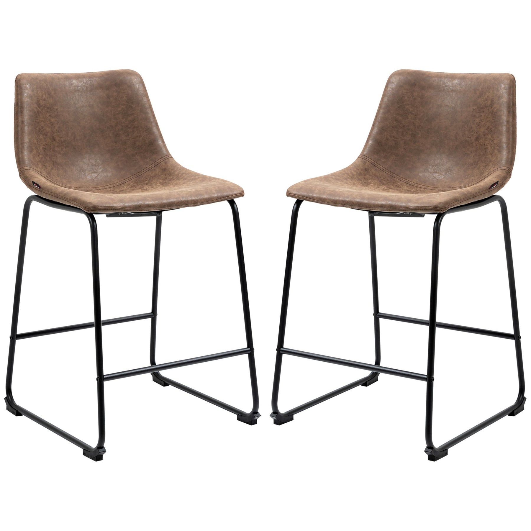 Upgrade your space with this stylish set of 2 barstools, perfect for kitchen islands, pub tables, or home lounges. With a vintage-inspired design, these stools feature durable PU leather with a distressed effect for an elegant yet comfortable feel. The leather is water and stain-resistant, allowing for easy cleanup with a damp towel. The sturdy steel legs provide exceptional stability, while the integrated footrest ensures comfort during extended sitting. These stools are equipped with plastic foot pads to protect your floors from scratches, making them a versatile and practical addition to your home.