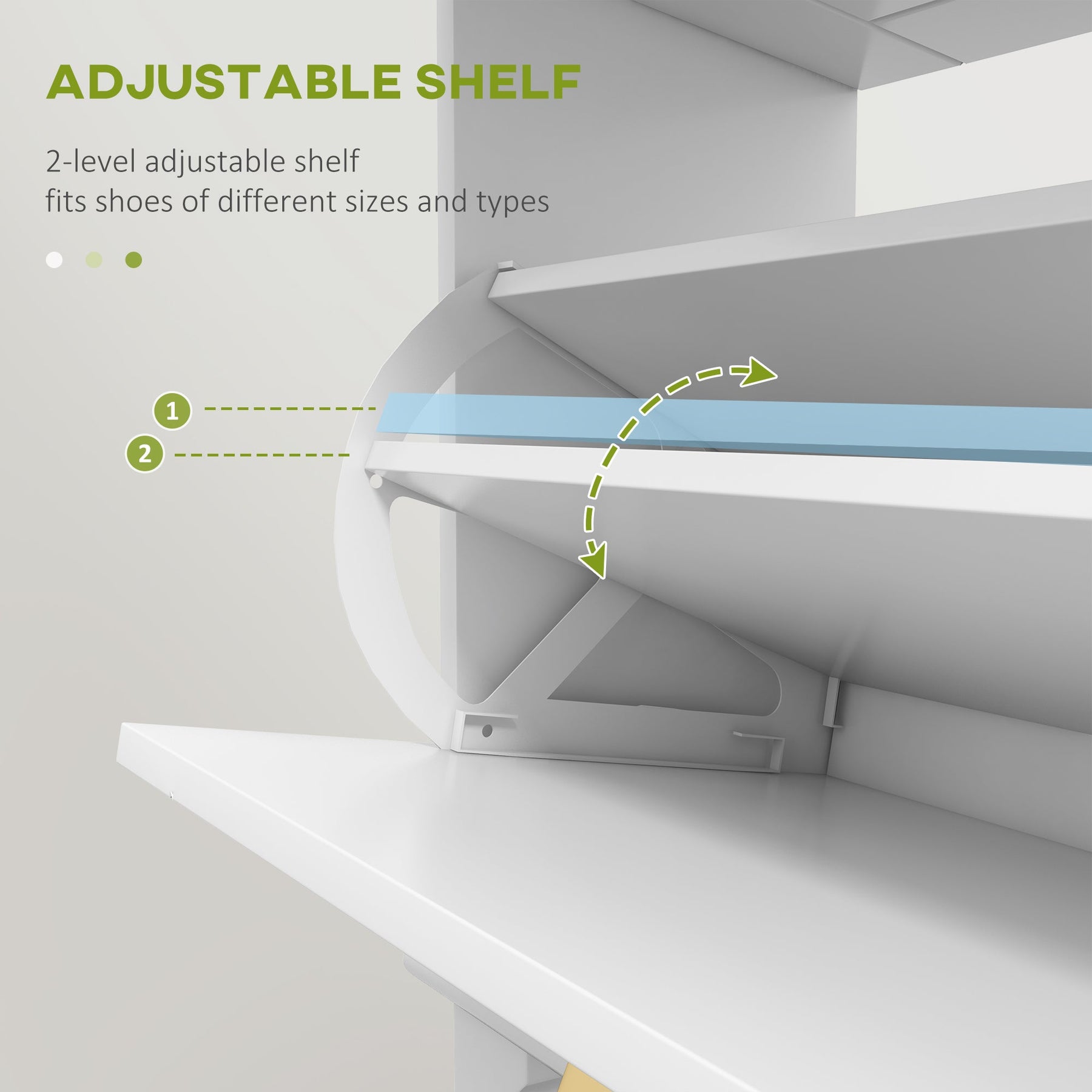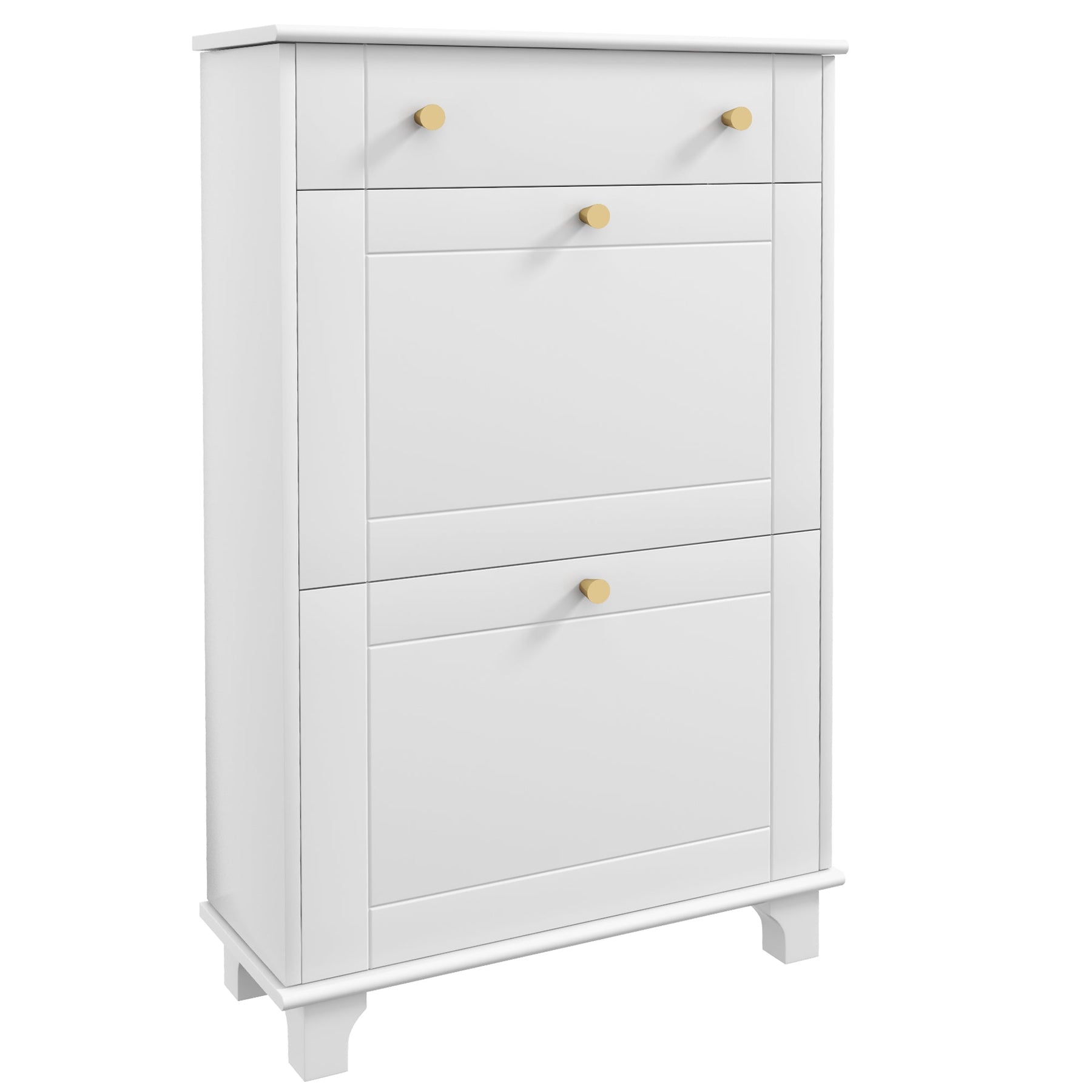 Add a touch of elegance to your home with this modern shoe cabinet for entryways. Featuring a sleek finish, carved lines, and stylish gold handles, this cabinet will effortlessly elevate your home décor. The spacious storage includes two flip drawers with 2-level adjustable shelves in each drawer, offering ample room to store up to 8 pairs of shoes. The flat top serves as a perfect space for displaying small décor items or storing go-out essentials like keys and wallets. Despite its spacious design, this cabinet is compact and space-efficient, with a depth of just 9.3 inches, making it ideal for narrow entryways and hallways. Crafted from painted MDF and particleboard for durability, the cabinet is supported by five stable legs, and the anti-tipping design ensures added safety. Organize your shoes and keep your entryway looking stylish with this functional and elegant piece.
